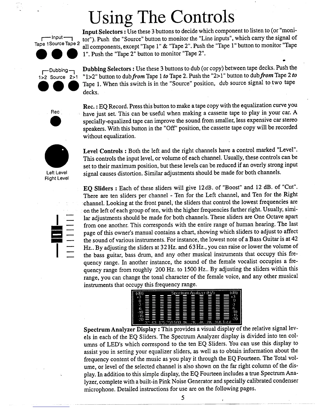 AudioSource EQ 14 - Using the Operational Controls; Input, Dubbing, and Recording Functions; Level, EQ Sliders, and Spectrum Analyzer