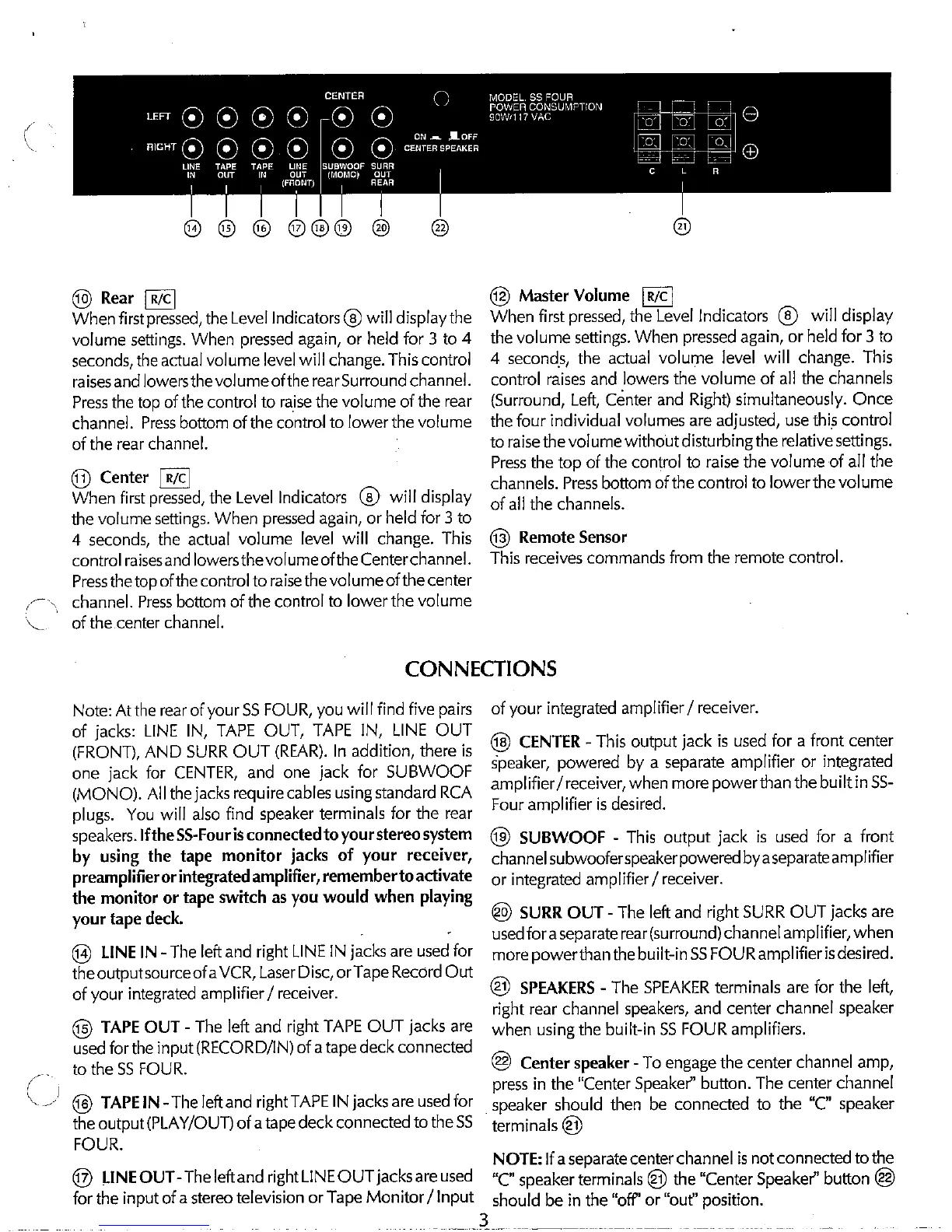AudioSource SS FOUR - Rear Panel Controls; Volume and Remote Sensor; Connections and Wiring; Audio Input;Output and Tape Jacks