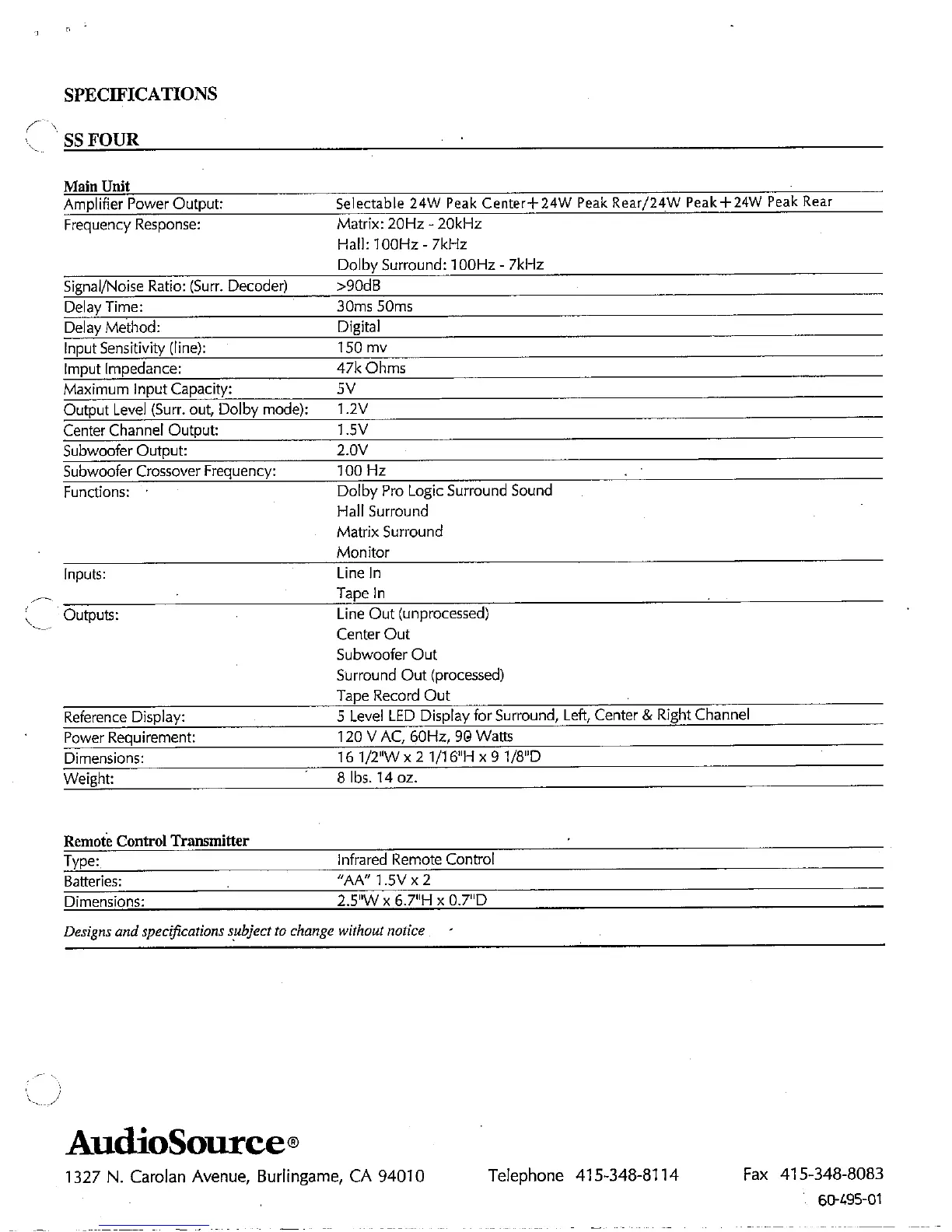 AudioSource SS FOUR - Product Specifications; Main Unit Specifications; Remote Transmitter Specifications