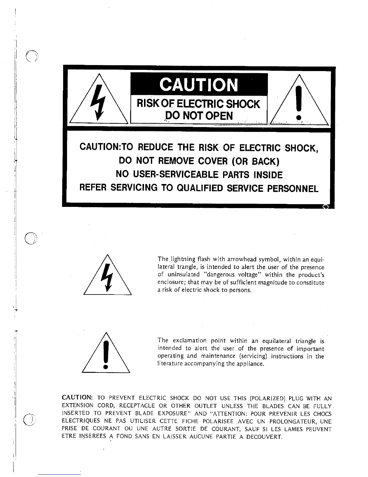 AudioSource SS One/II - Safety Cautions; Electric Shock and Symbol Warnings