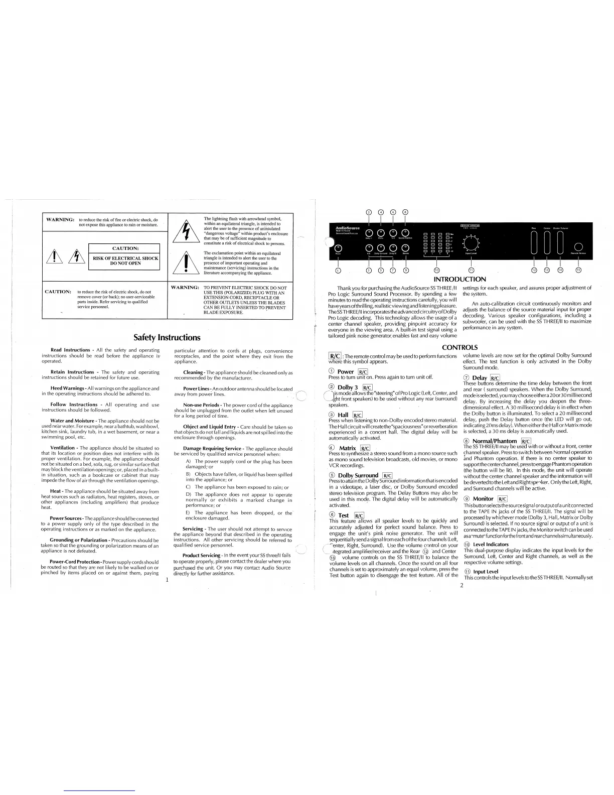 AudioSource SS THREE II - Safety Instructions; General Safety Precautions; Controls Overview; Front Panel Controls