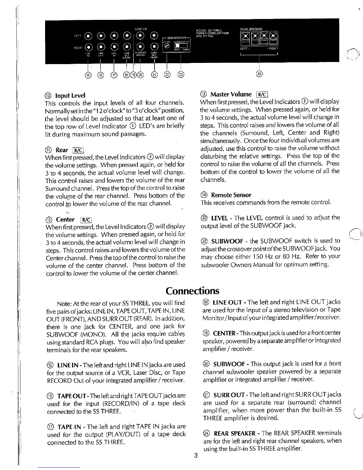 AudioSource SS THREE - Input Level and Volume Controls; Connections; Input and Output Jacks; Rear Speaker Terminals