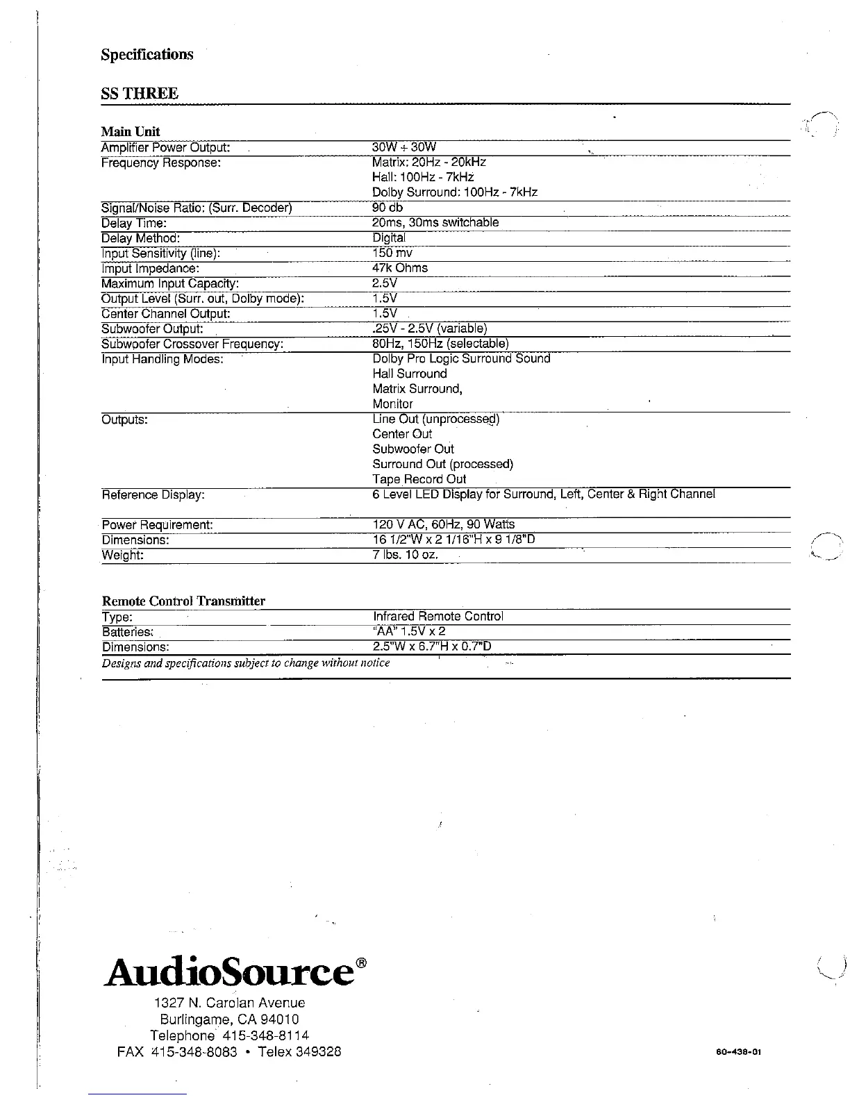 AudioSource SS THREE - Specifications; Main Unit Specifications; Remote Control Transmitter Specifications