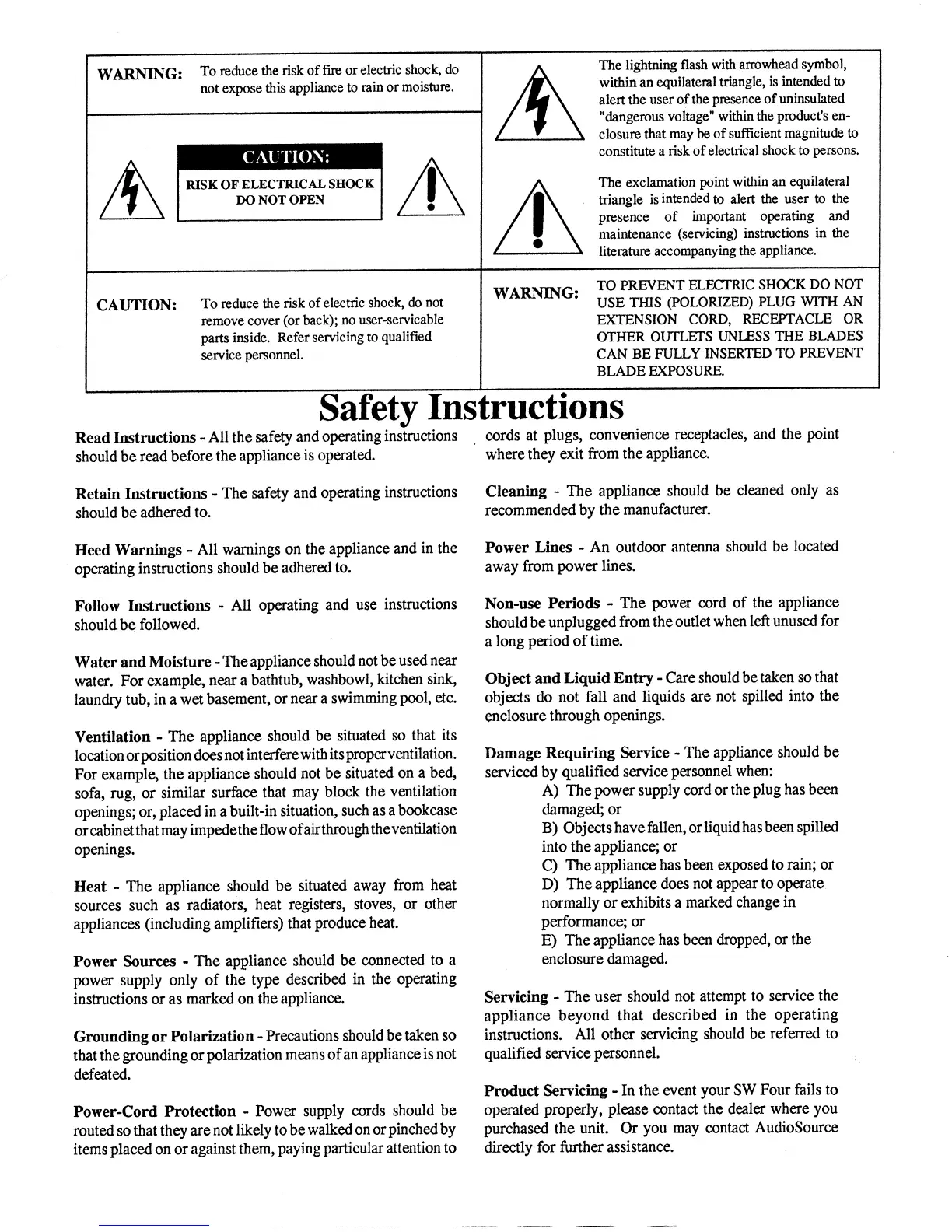 AudioSource SW 4 - Safety Instructions; Electrical Safety Precautions; Operational Safety Guidelines; Servicing and Product Issues