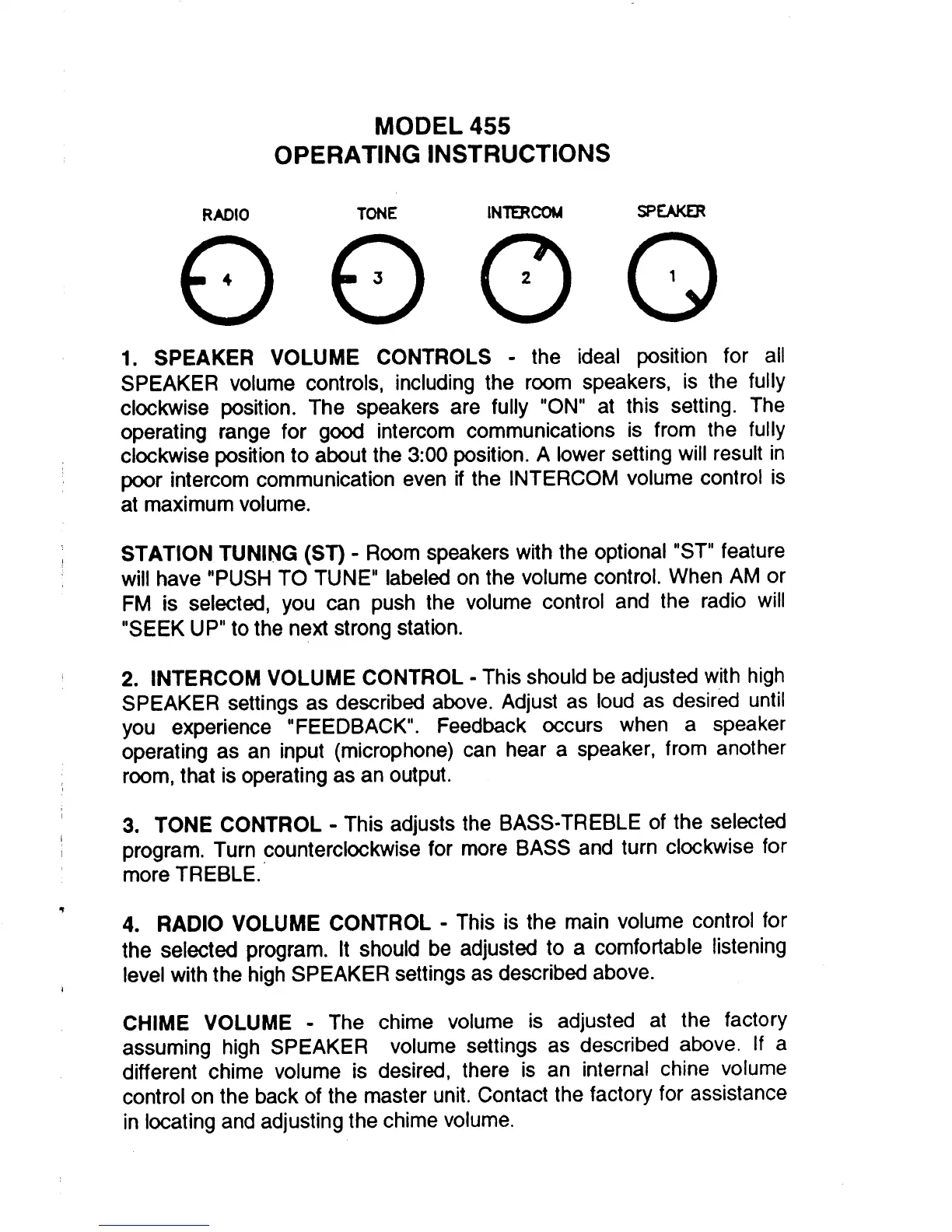 Audiotech 455 - Speaker Volume Controls; Intercom Volume Control; Tone Control; Radio Volume Control