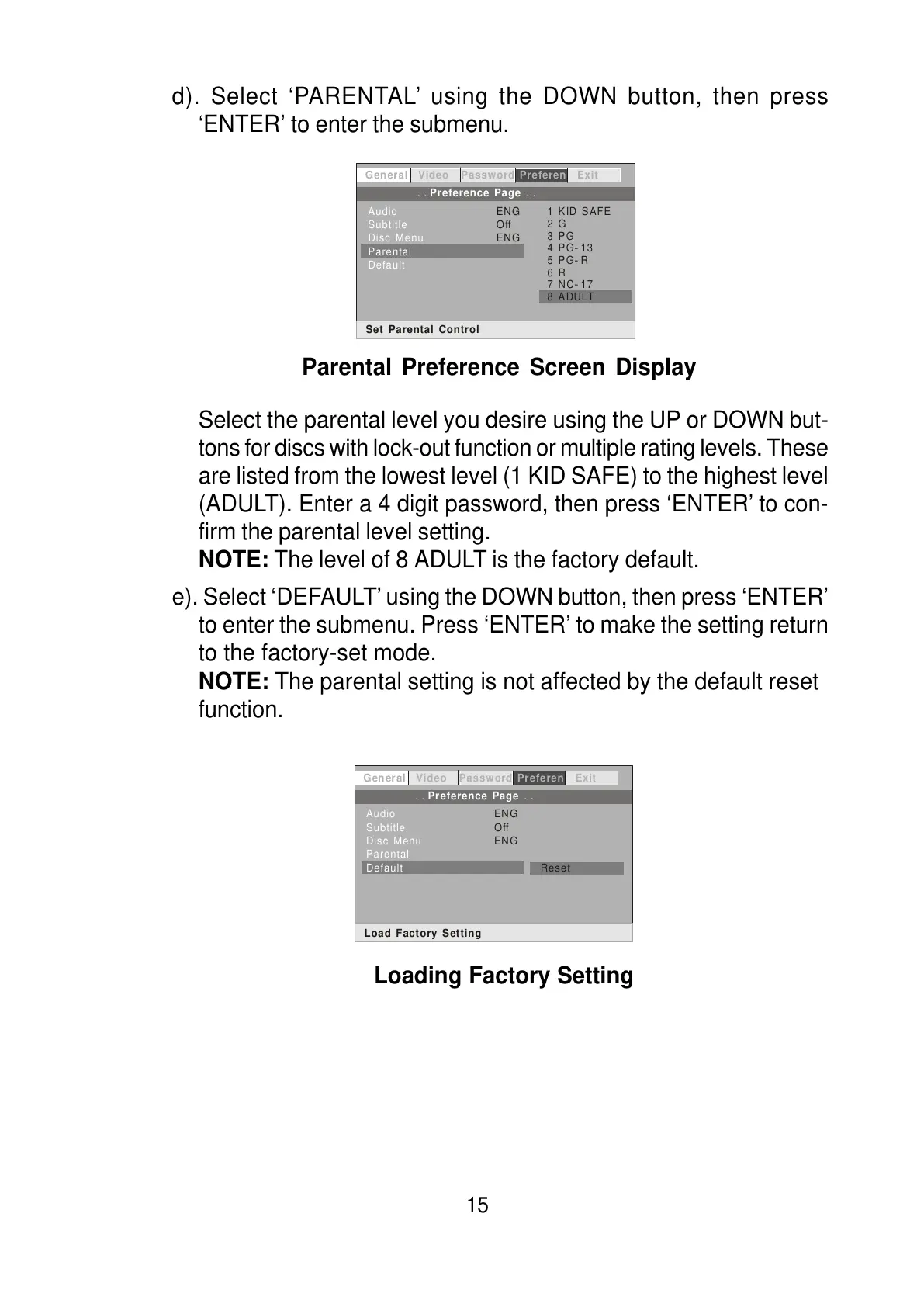 NOTE: The parental setting is not affected by the default reset