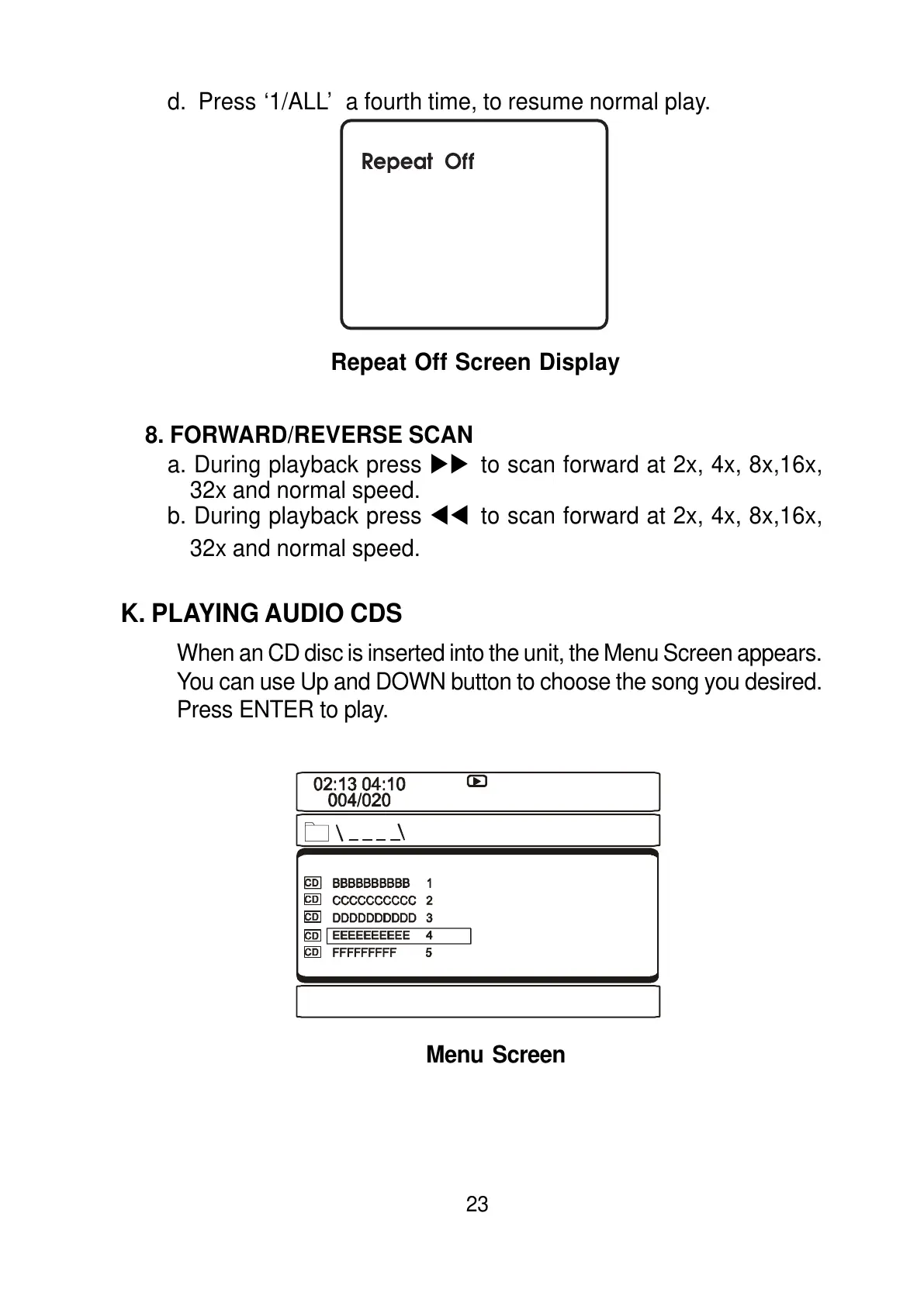 When an CD disc is inserted into the unit, the Menu Screen appears.