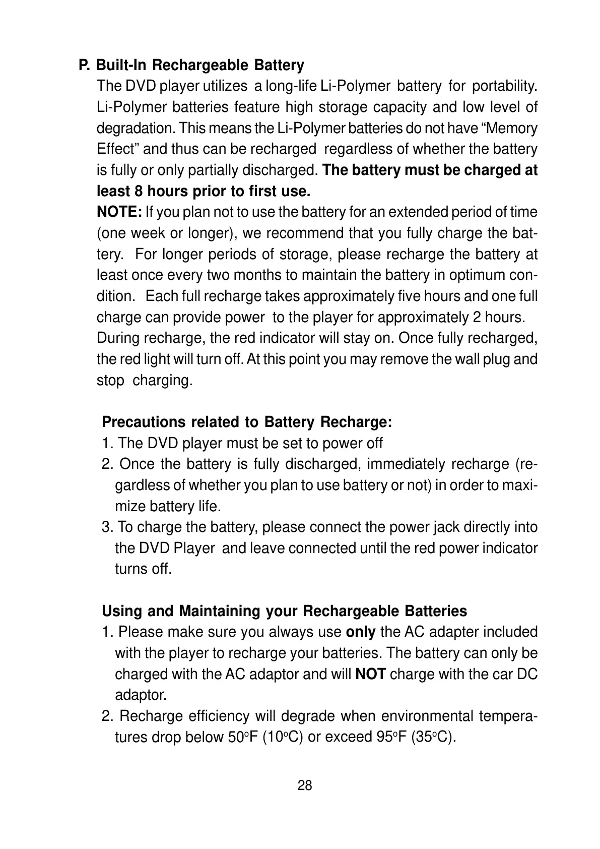 The DVD player utilizes a long-life Li-Polymer battery for portability.