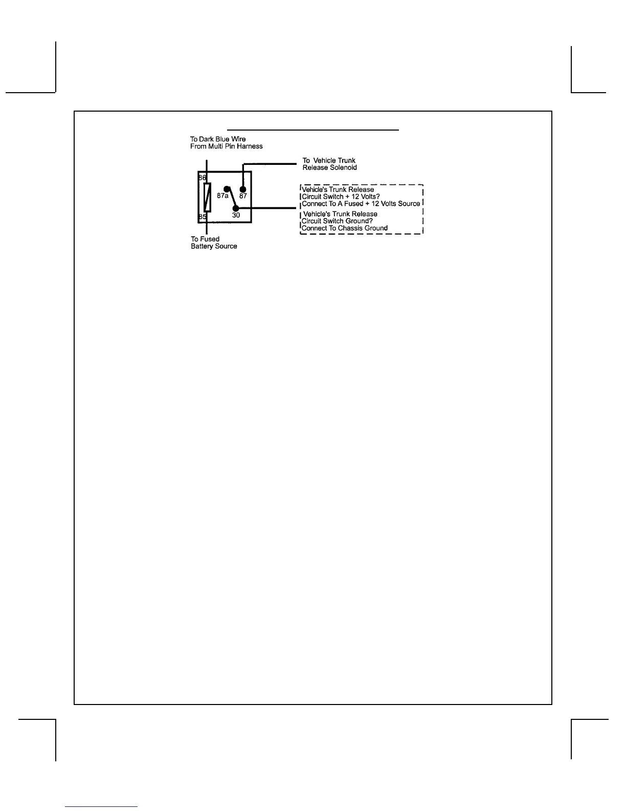 If the vehicle uses a + 12 VDC horn switch, then connect the black w/ white trace wire to terminal 86 of the