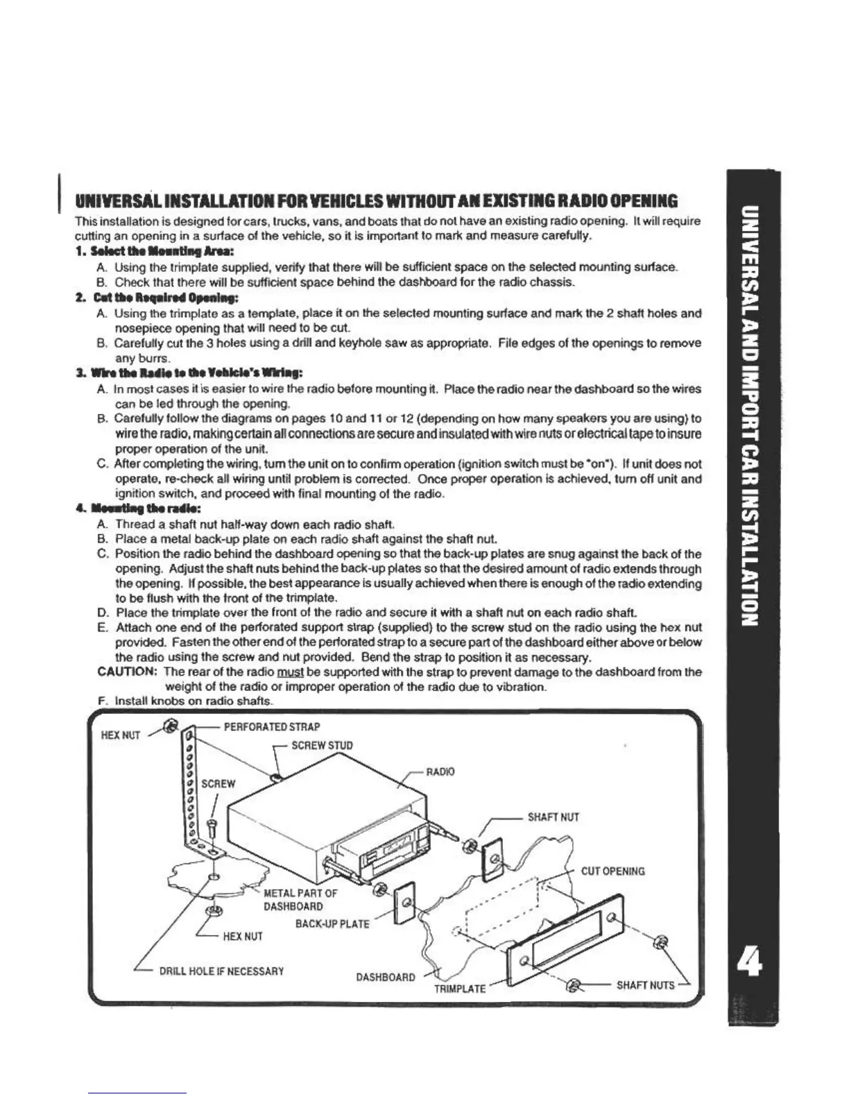 This installation is designed for cars, trucks, vans, and boats that do not have an existing radio opening. It will require