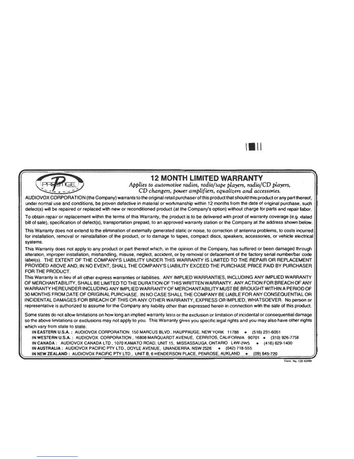 IN AUSTRALIA: AUDIOVOX PACIFIC PTY LTD., DOYLE AVENUE, UNANDERRA, NSW 2526 .(042) 718-555
