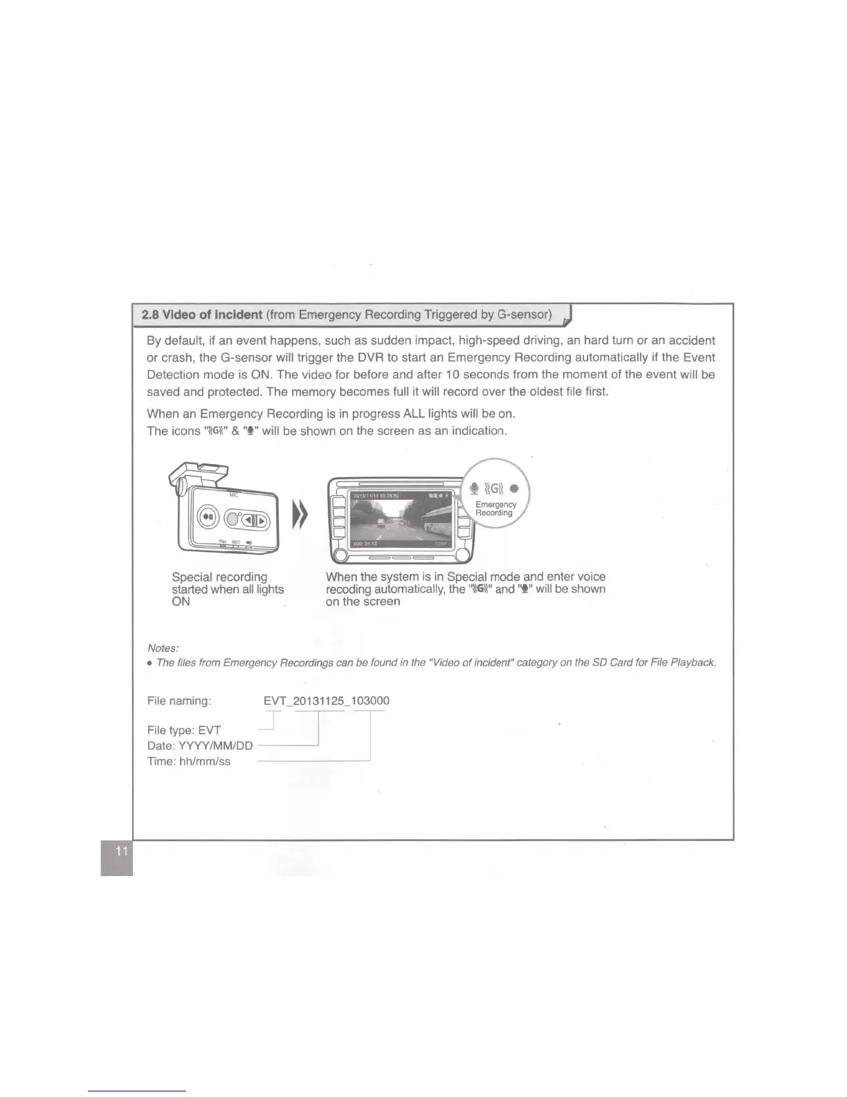 crash, the G-sensor will trigger the DVR to start an Emergency Recording automatically if the Event