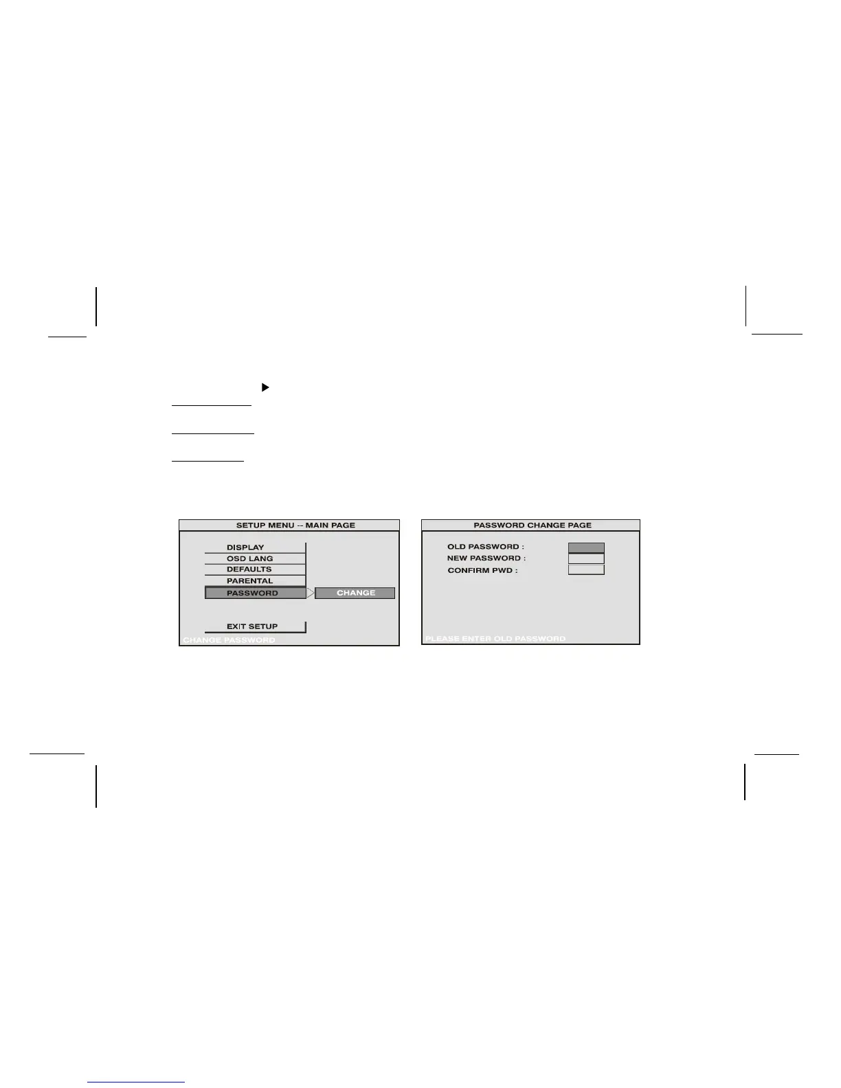 Press the SETUP button and select PASSWORD. The PASSWORD SETUP allows you to change the parental