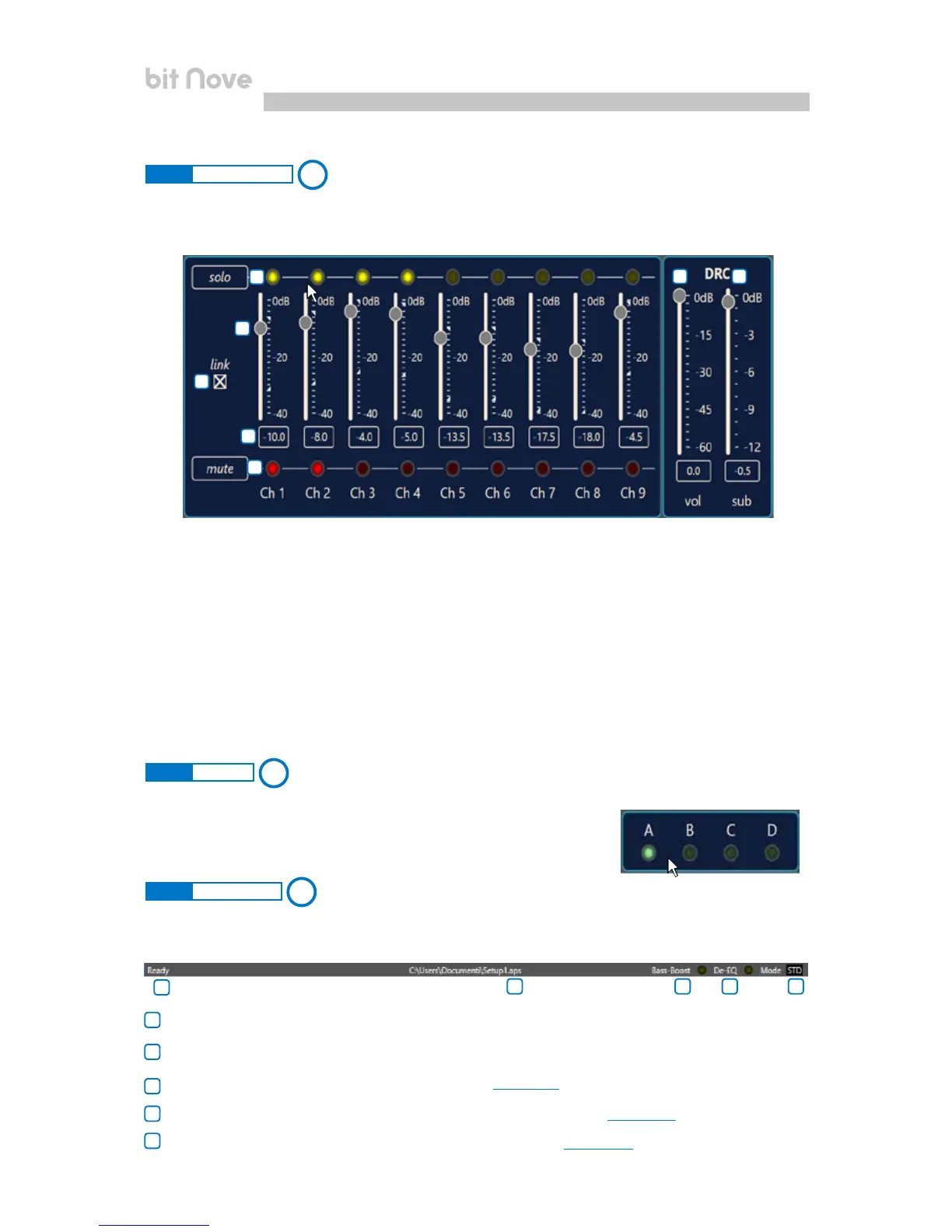 This section shows the settings related to the output levels of the bit Nove channels. The description of the points