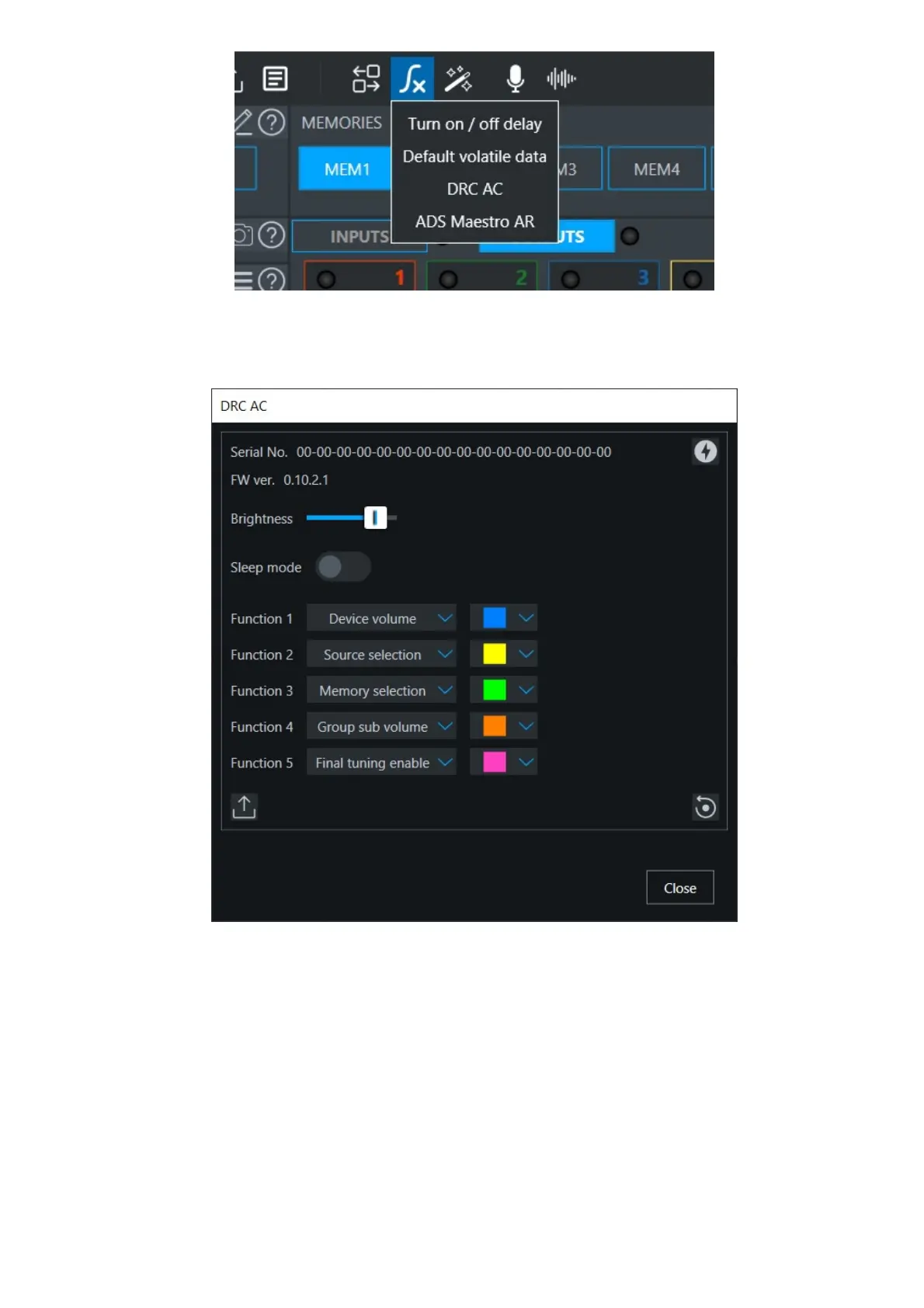 Audison DRC AC - DRC AC Configuration with Bit Drive Software; Accessing the DRC AC Settings Interface; Adjusting DRC AC Sleep Mode and Brightness; Customizing DRC AC Functions and Colors