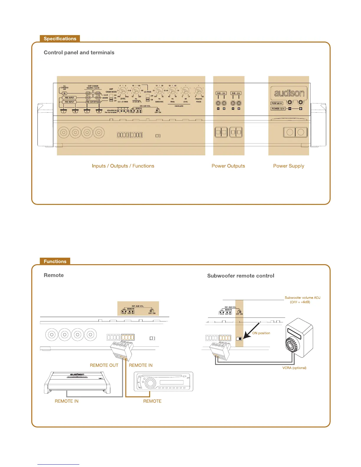 Audison SRx 1D - Specifications; Functions; Control Panel and Terminals; Remote Control