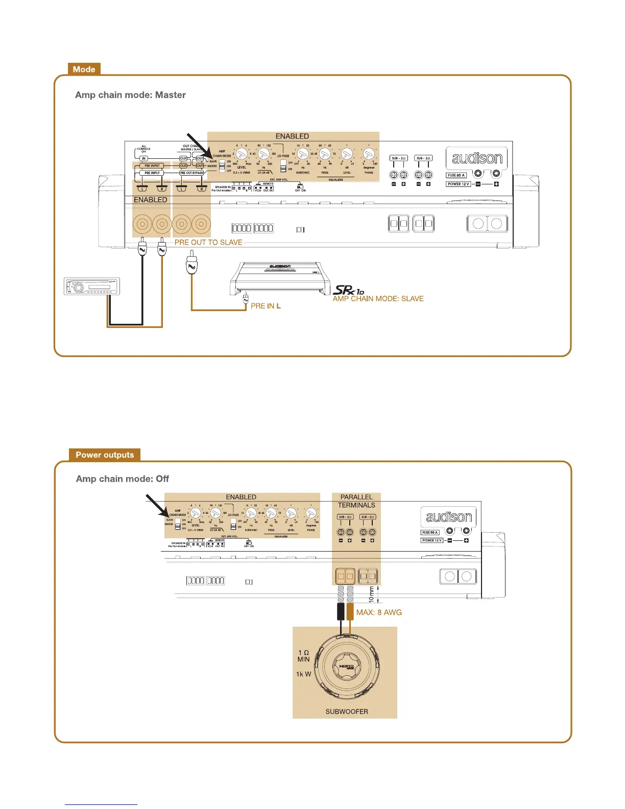 Audison SRx 1D - Mode; Power Outputs; Amp Chain Mode: Master; Amp Chain Mode: off