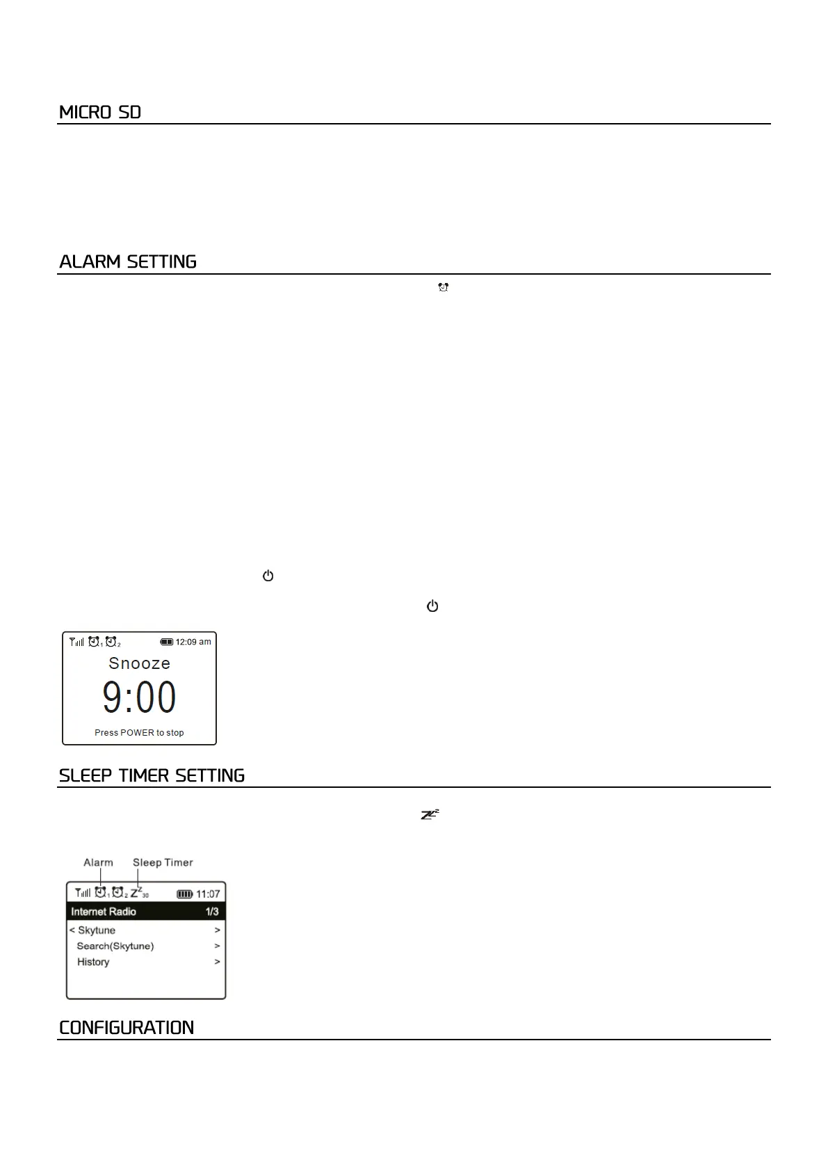 When the alarm goes off, press the [ ] to stop the alarm or press the [Tune/OK] knob to activate the Snooze feature.