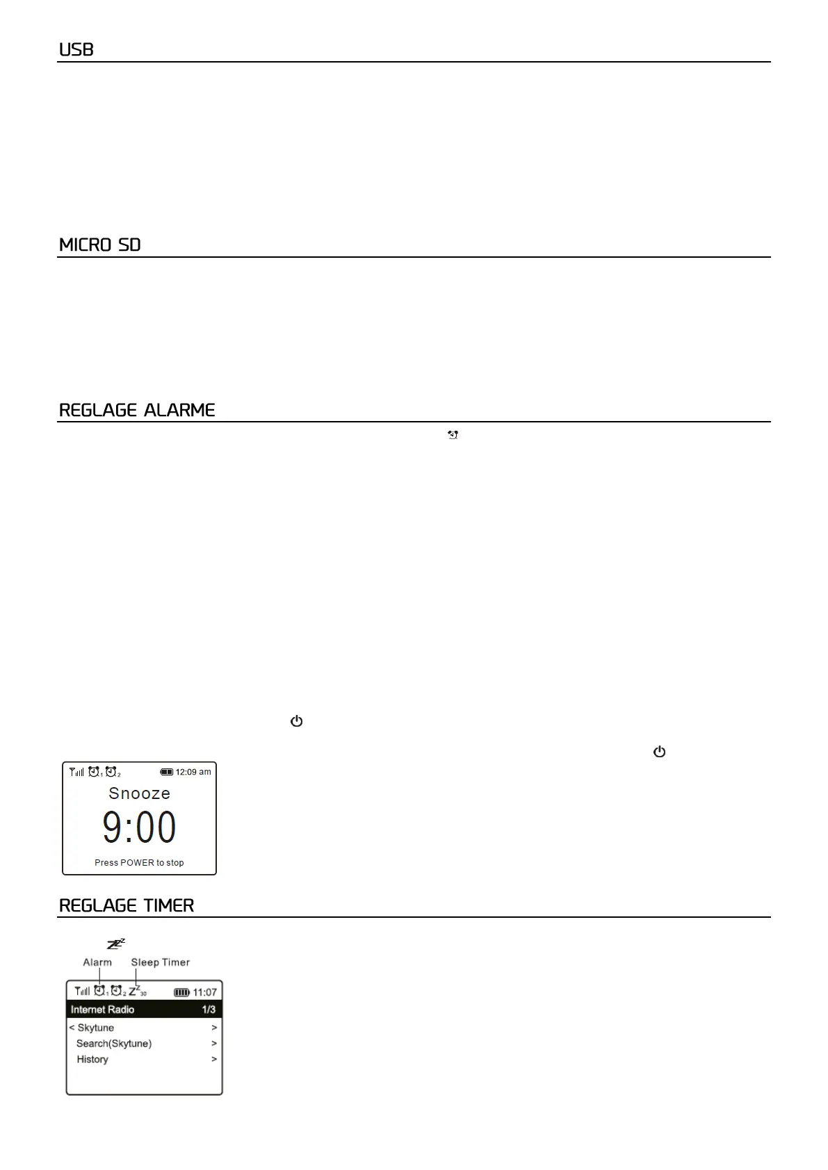 Lorsque l'alarme se déclenche, appuyez [ ] pour arrêter l'alarme ou appuyez sur [Tune/OK] pour activer la fonction Snooze.