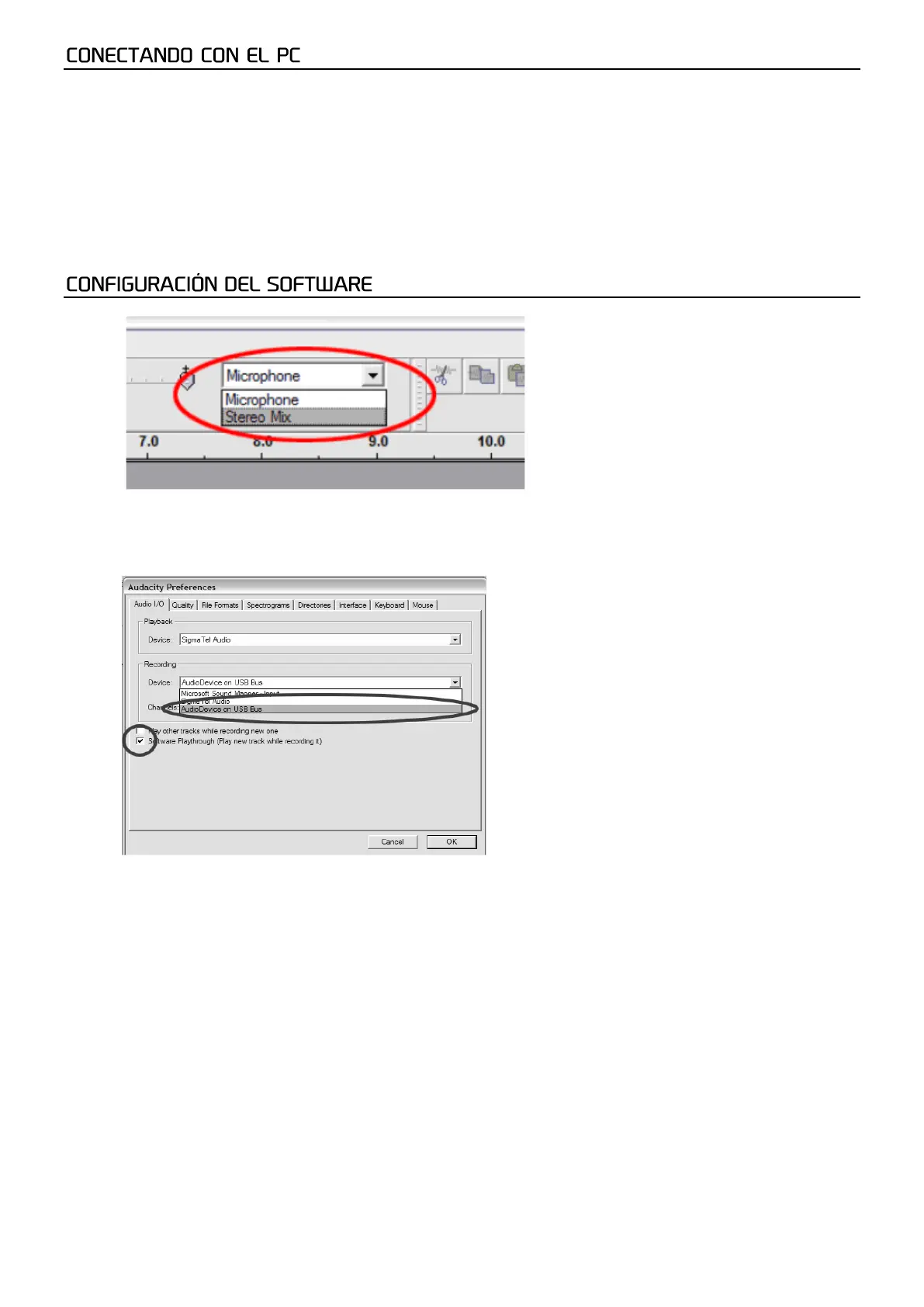 software" para escuchar el audio durante la grabación.