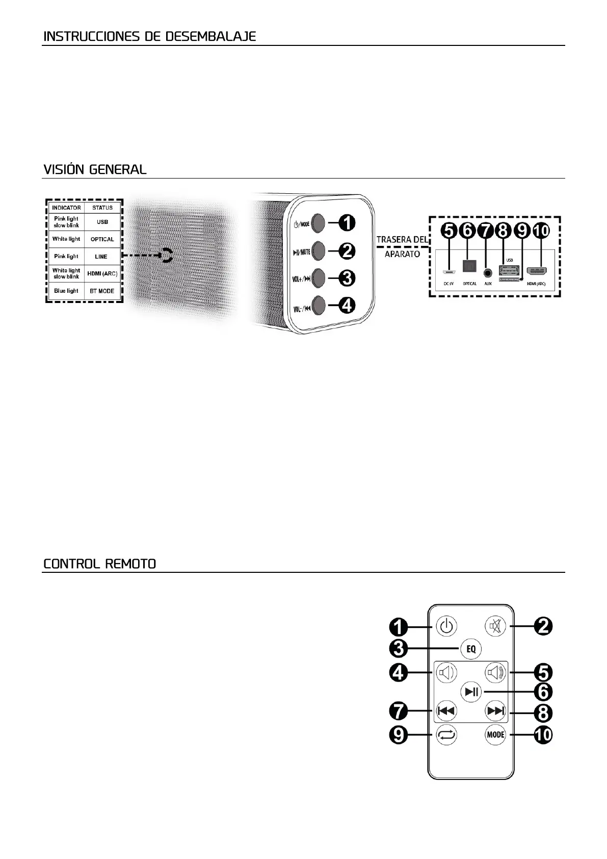 Pulse para recorrer todos los modos disponibles (línea, óptico, BT, USB y HDMI (ARC)). Pulsación larga para