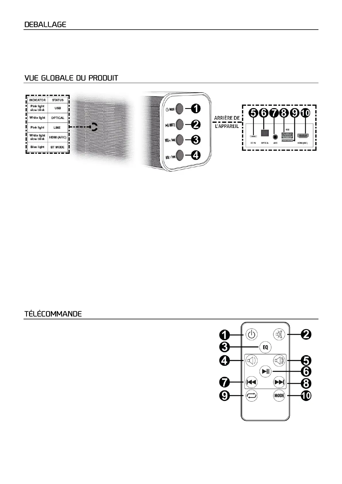 Appuyez pour changer de mode. Passez en revue les modes ligne, optique, BT, USB et HDMI (ARC).