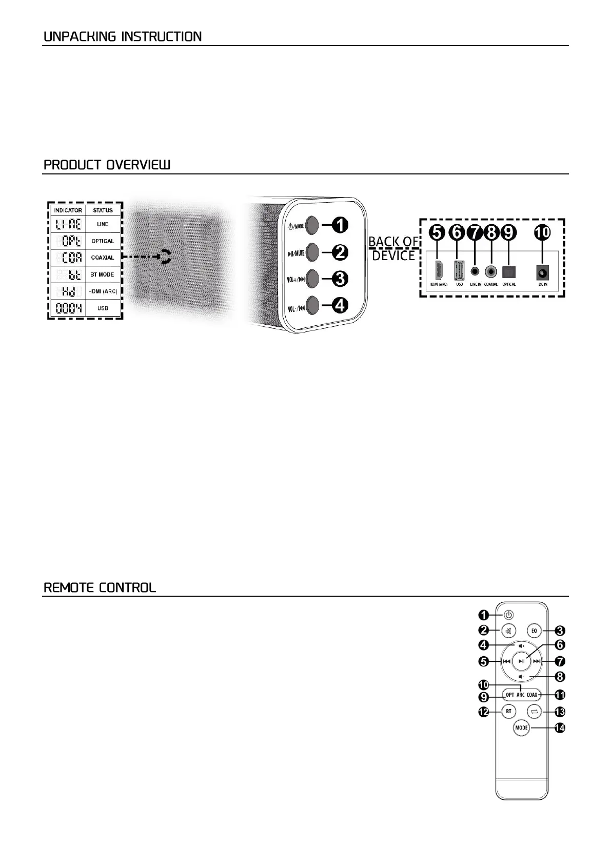 Press to cycle through all available modes (line, optical, coaxial, BT, USB and HDMI (ARC)). Long press to turn the device