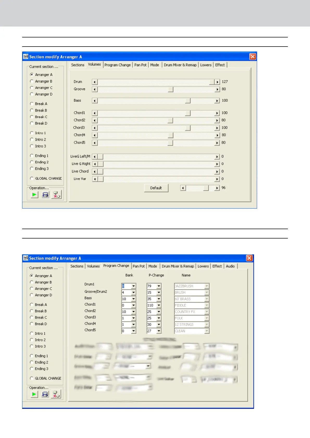 On the following menus you can modify the Program Changes and Pan Pot value for Drum1, Groove/Drum2, Bass,