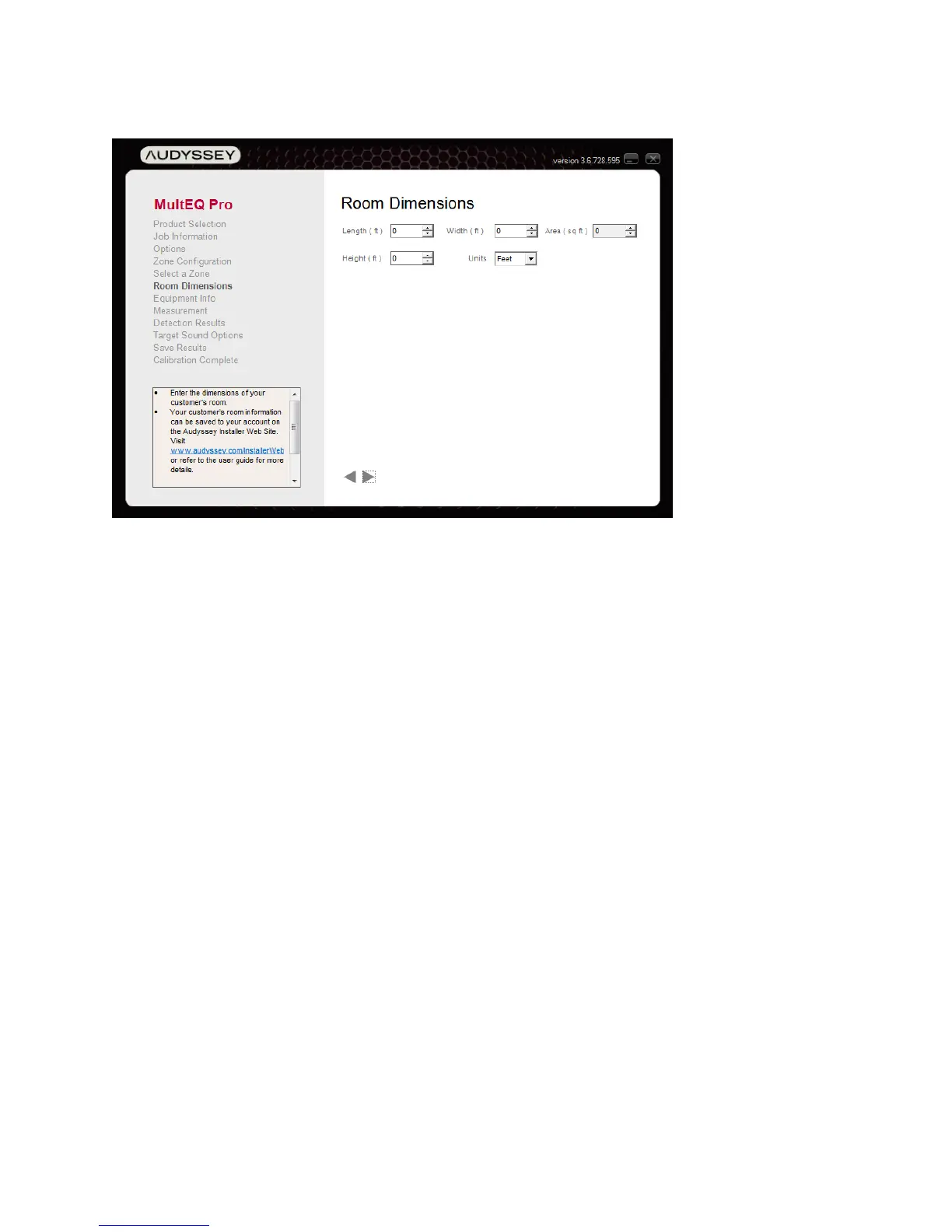 Enter the dimensions of the listening room by clicking the up/down arrows next to each field or