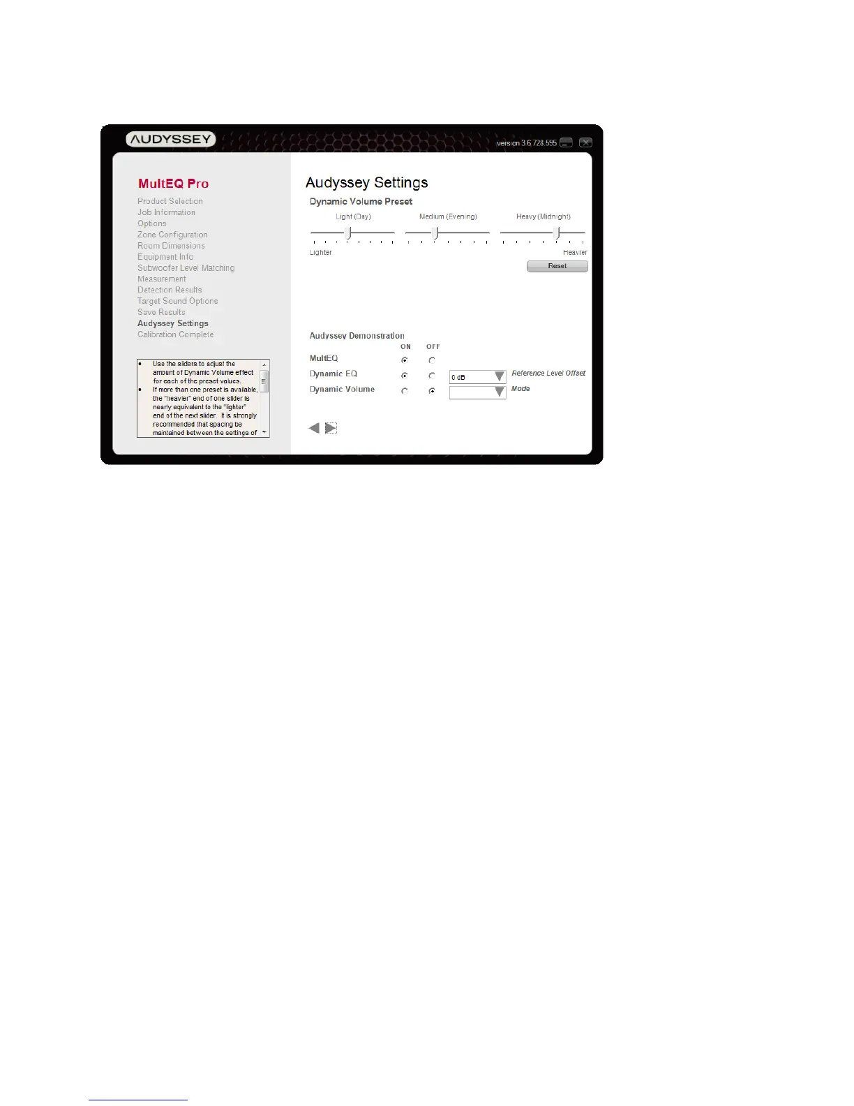 The “Audyssey Settings” screen is displayed if the product supports configuration of Dynamic