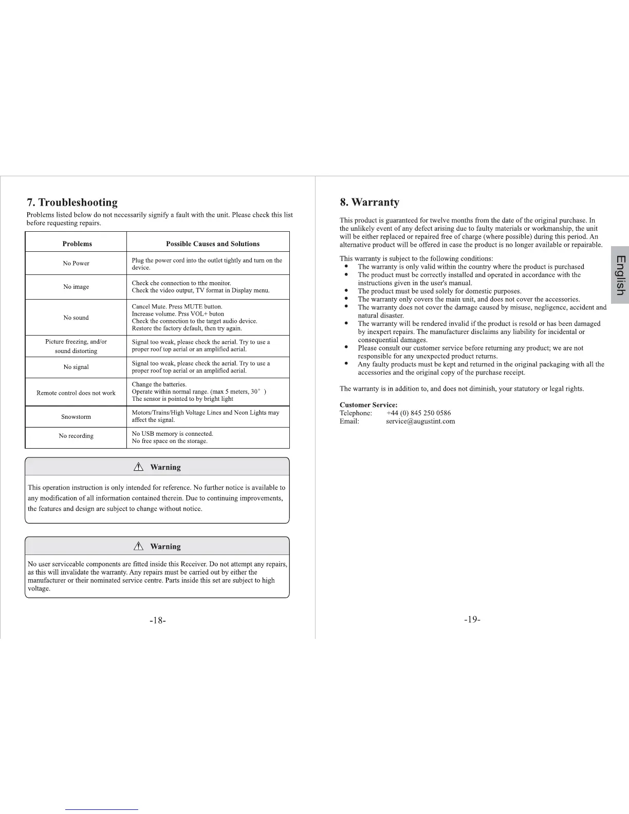 August DVB400 - Troubleshooting Guide; Warranty Information