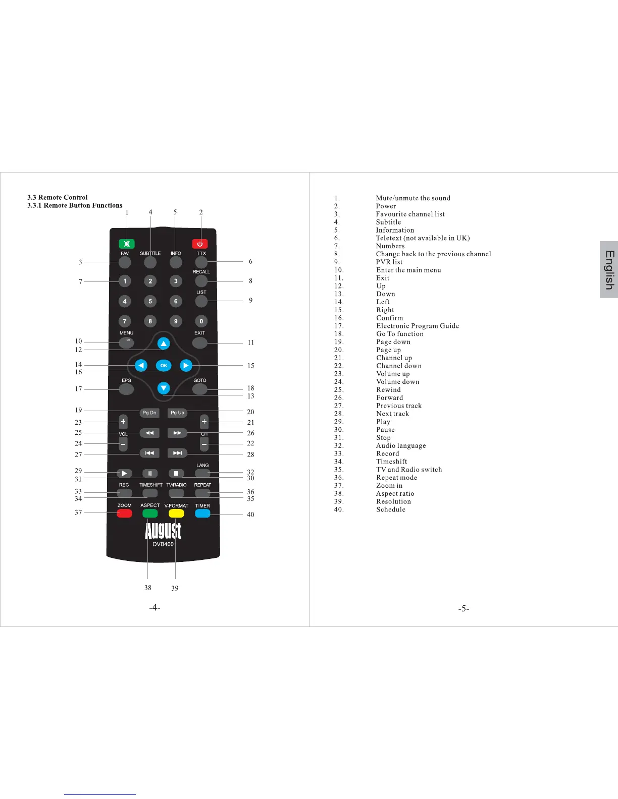 August DVB400 - Remote Control Operation; Remote Button Functions