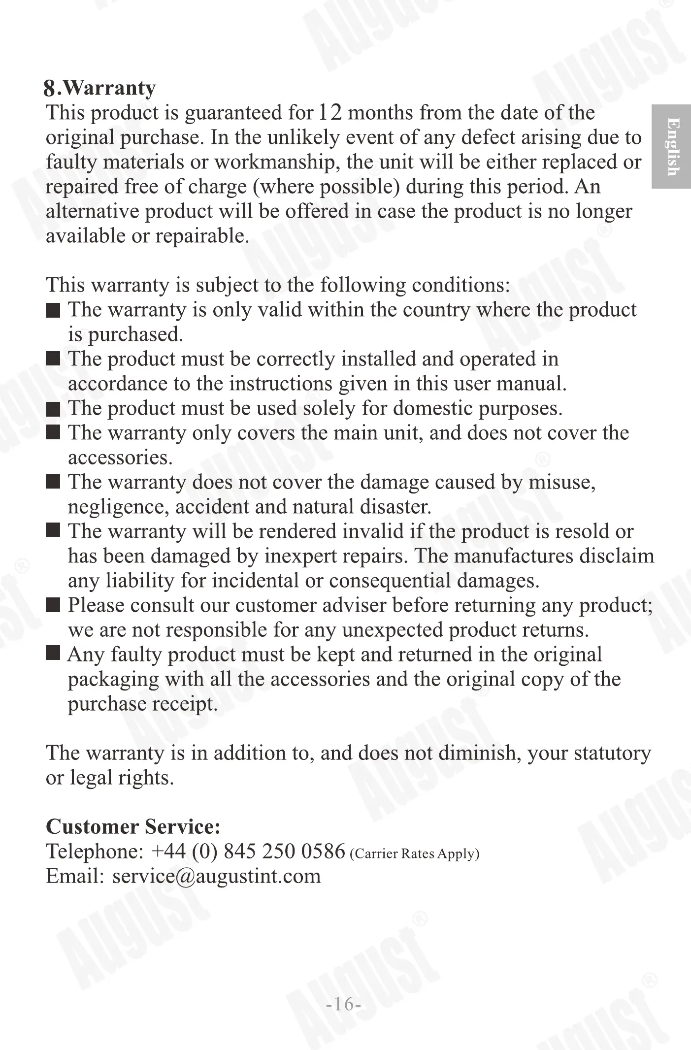Any faulty product must be kept and returned in the original