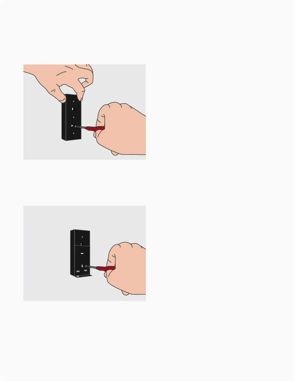 Attach the wedge to the wall irst, using the included screws into the drilled holes or
