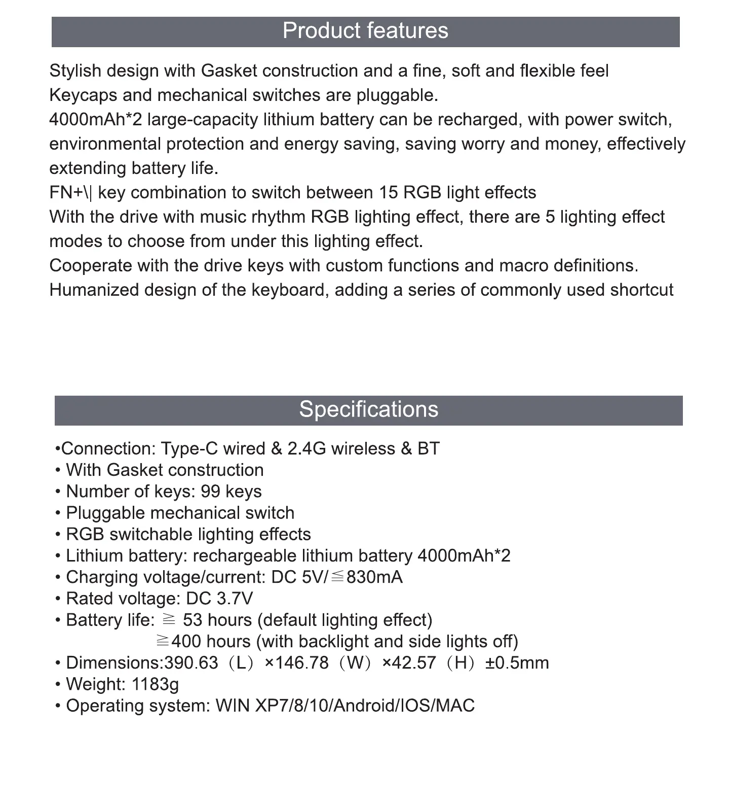 •Connection: Type-C wired & 2 4G wireless & BT