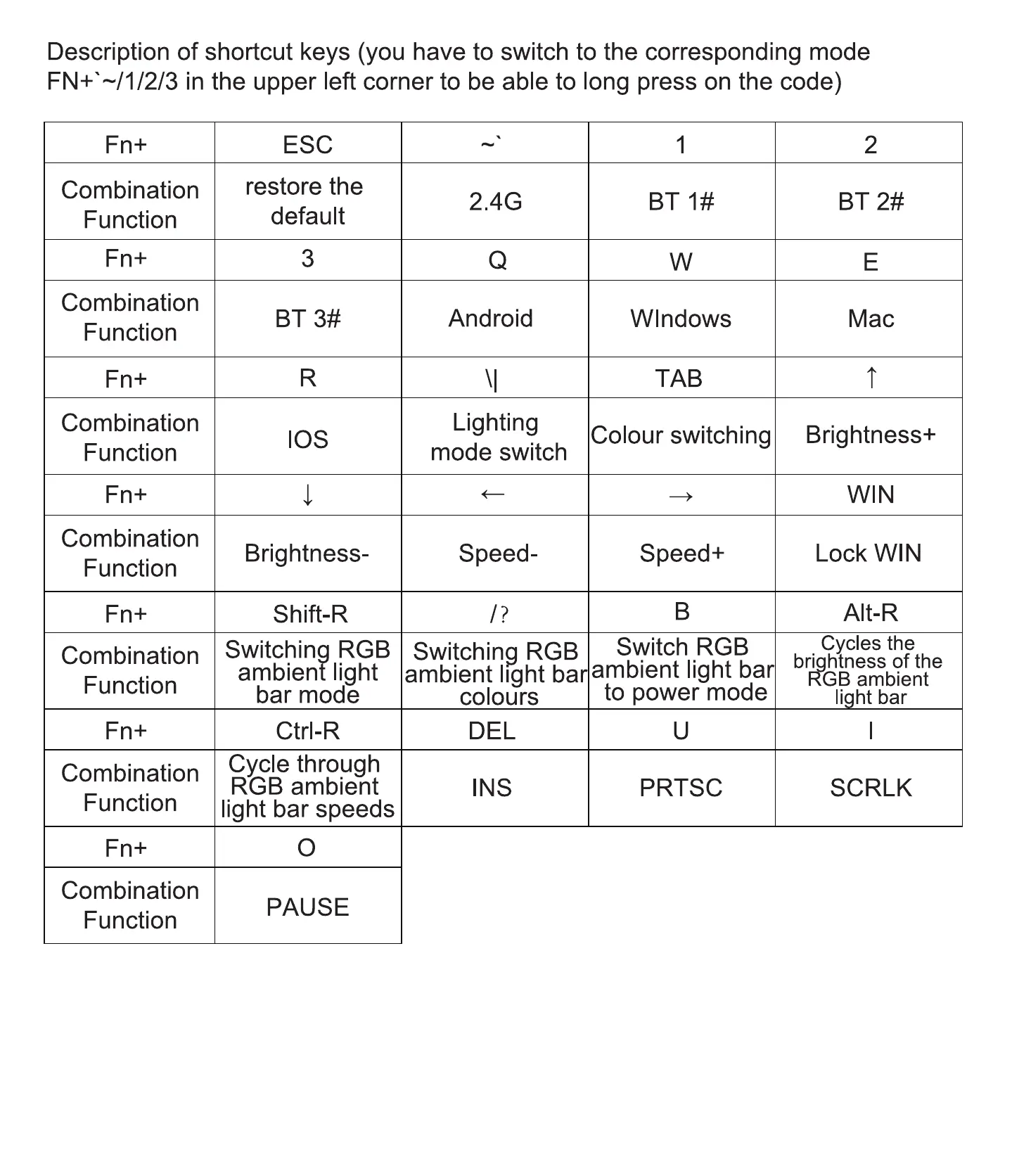 FN+R=IOS system (R key red light flashes for 3s), F-zone single press function and