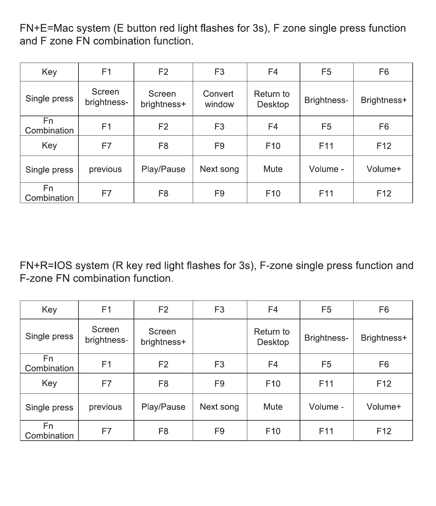 FN+E=Mac system (E button red light flashes for 3s), F zone single press function