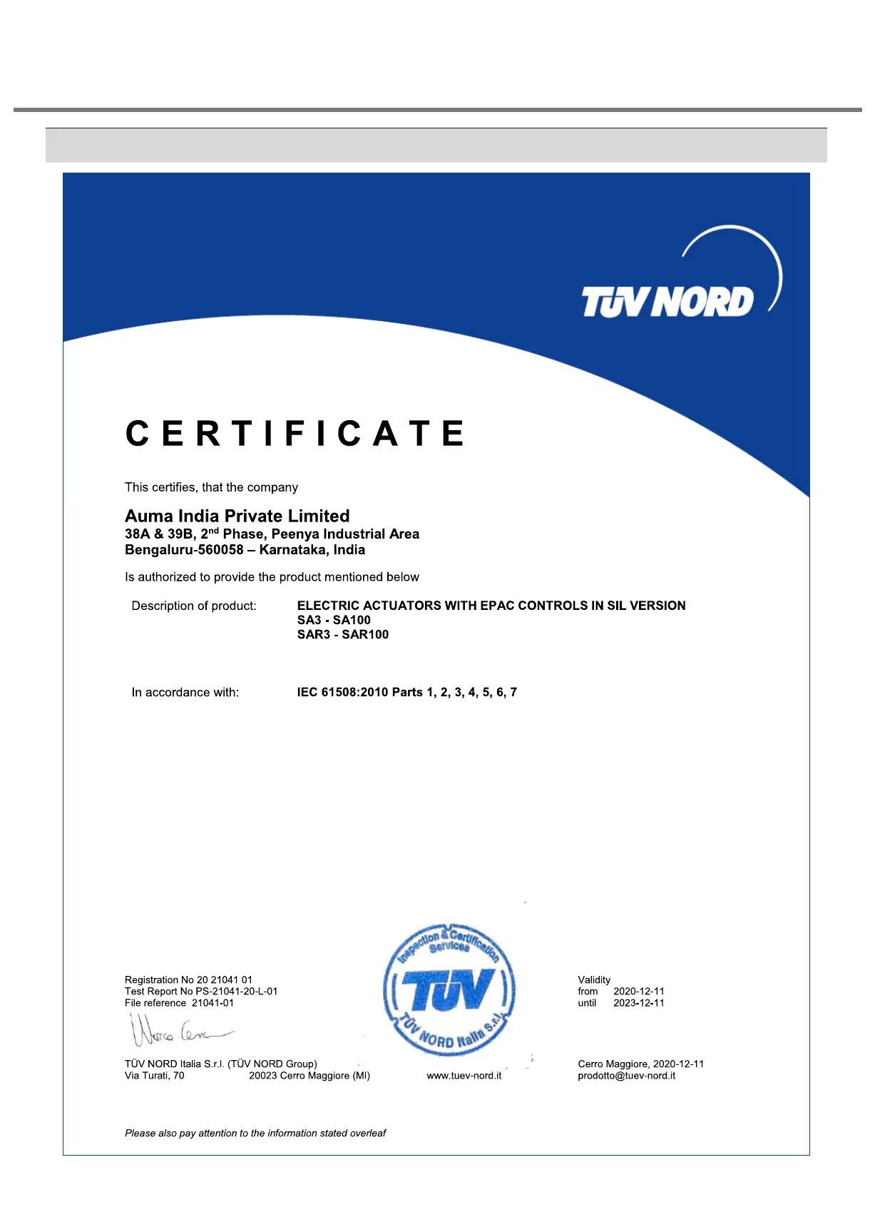 AUMA SA3 - 10 SIL Certificate