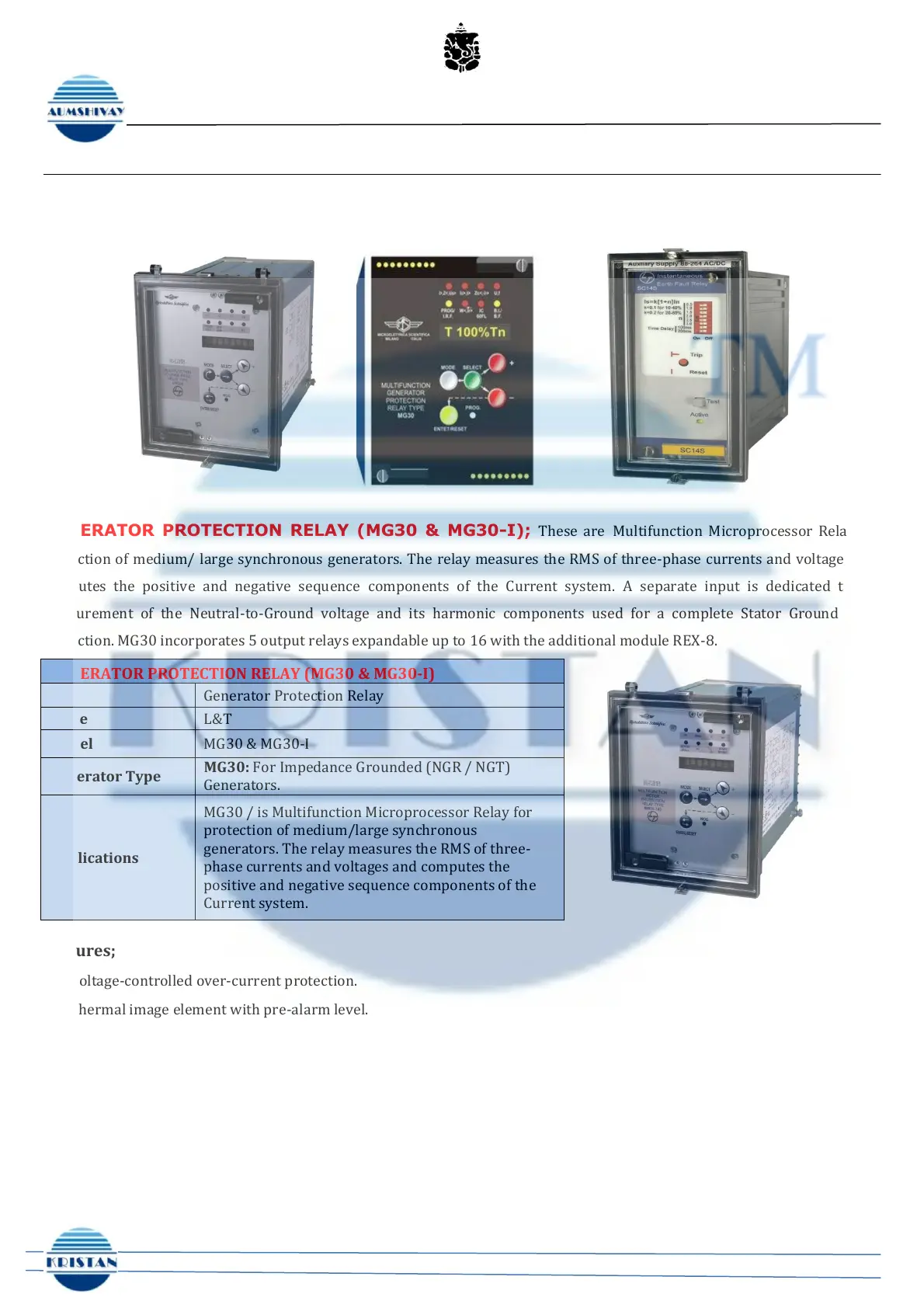 GENERATOR PROTECTION RELAY (MG30 & MG30-I); These are Multifunction Microprocessor Relay for