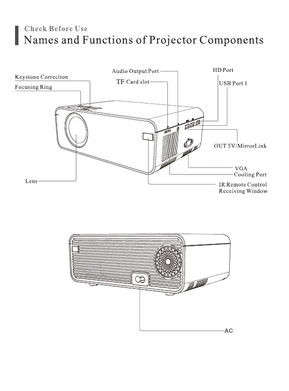 AUN W18 - Check Before Use; Names and Functions of Projector Components