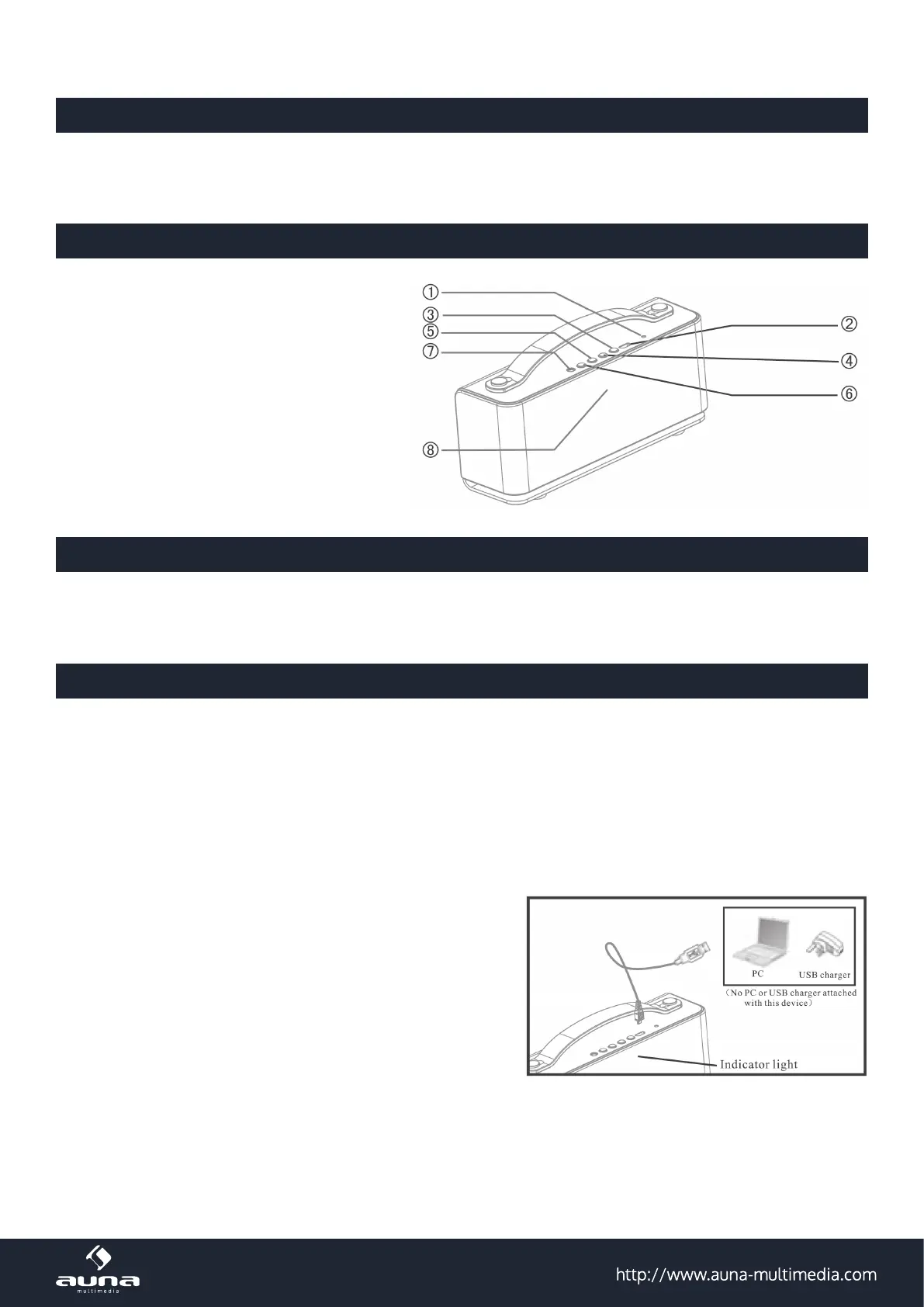 • Blue light turns on: No audio cable or Bluctooth device is connected yet.