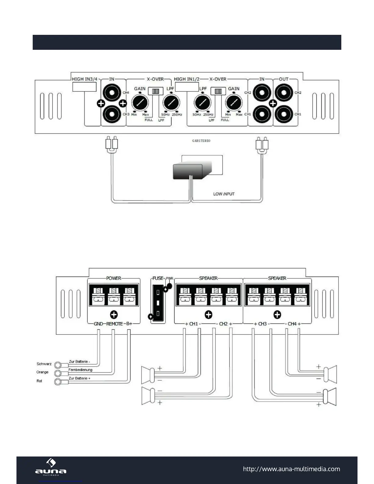 Anschluss der Lautsprecher und Stromquelle: