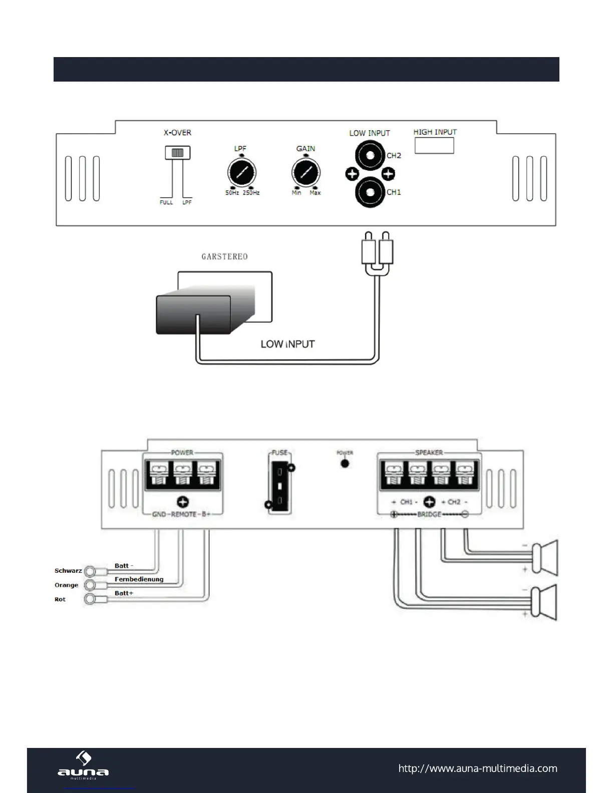 Anschluss der Lautsprecher und Stromquelle: