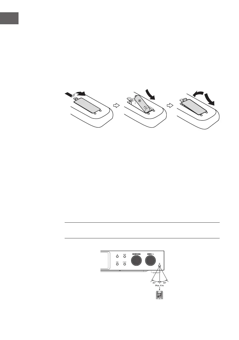 • Remove the battery from the remote control when not in use for a long
