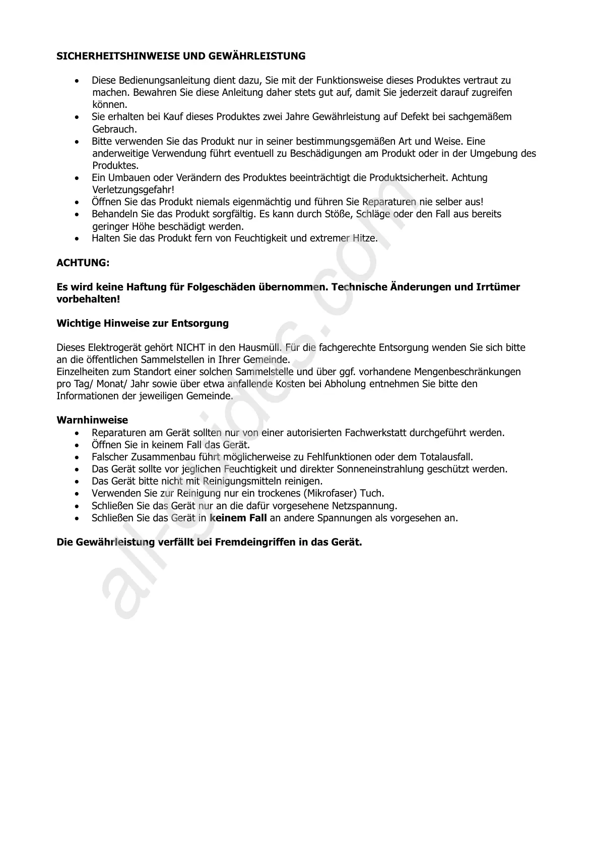 SICHERHEITSHINWEISE UND GEWÄHRLEISTUNG