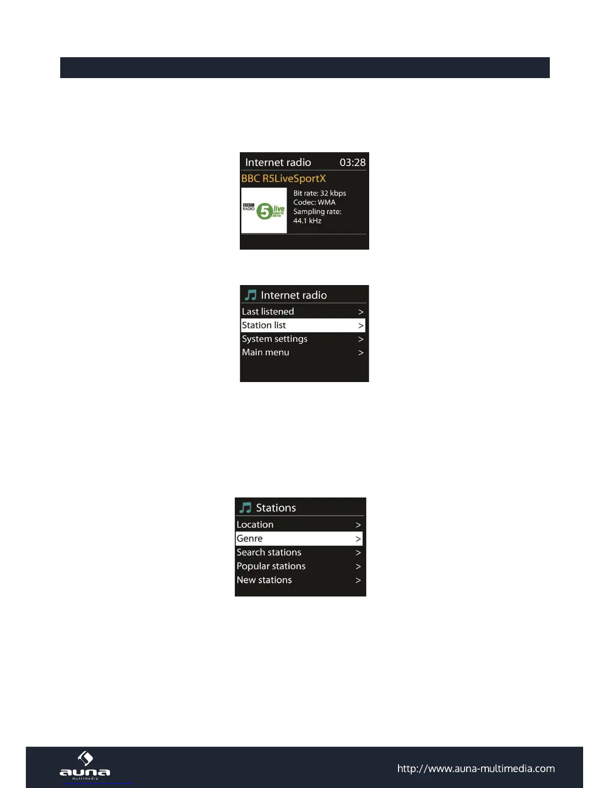 Cuando acceda de nuevo al modo Internet-Radio, se sintonizará la emisorá que escuchó en último lugar. Para elegir