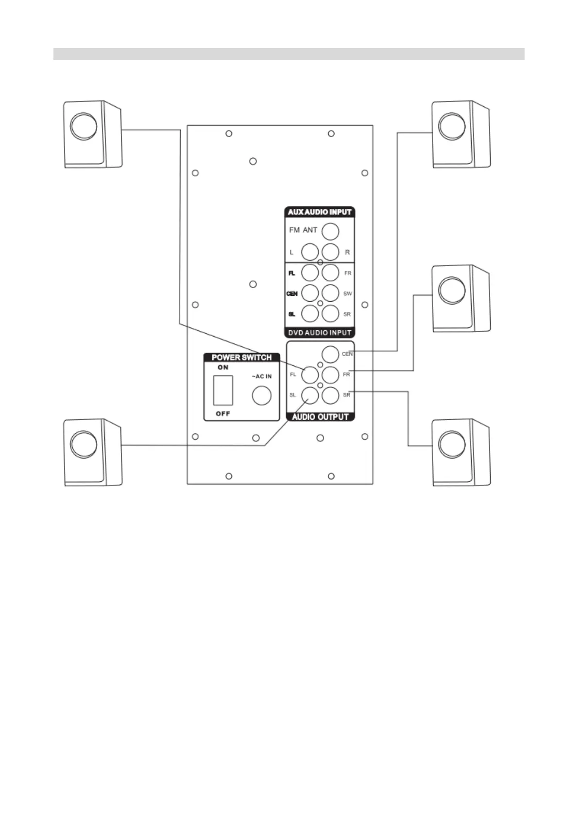 Connect front speakers, a center speaker, surround speaker to 5.1 speaker output terminals.