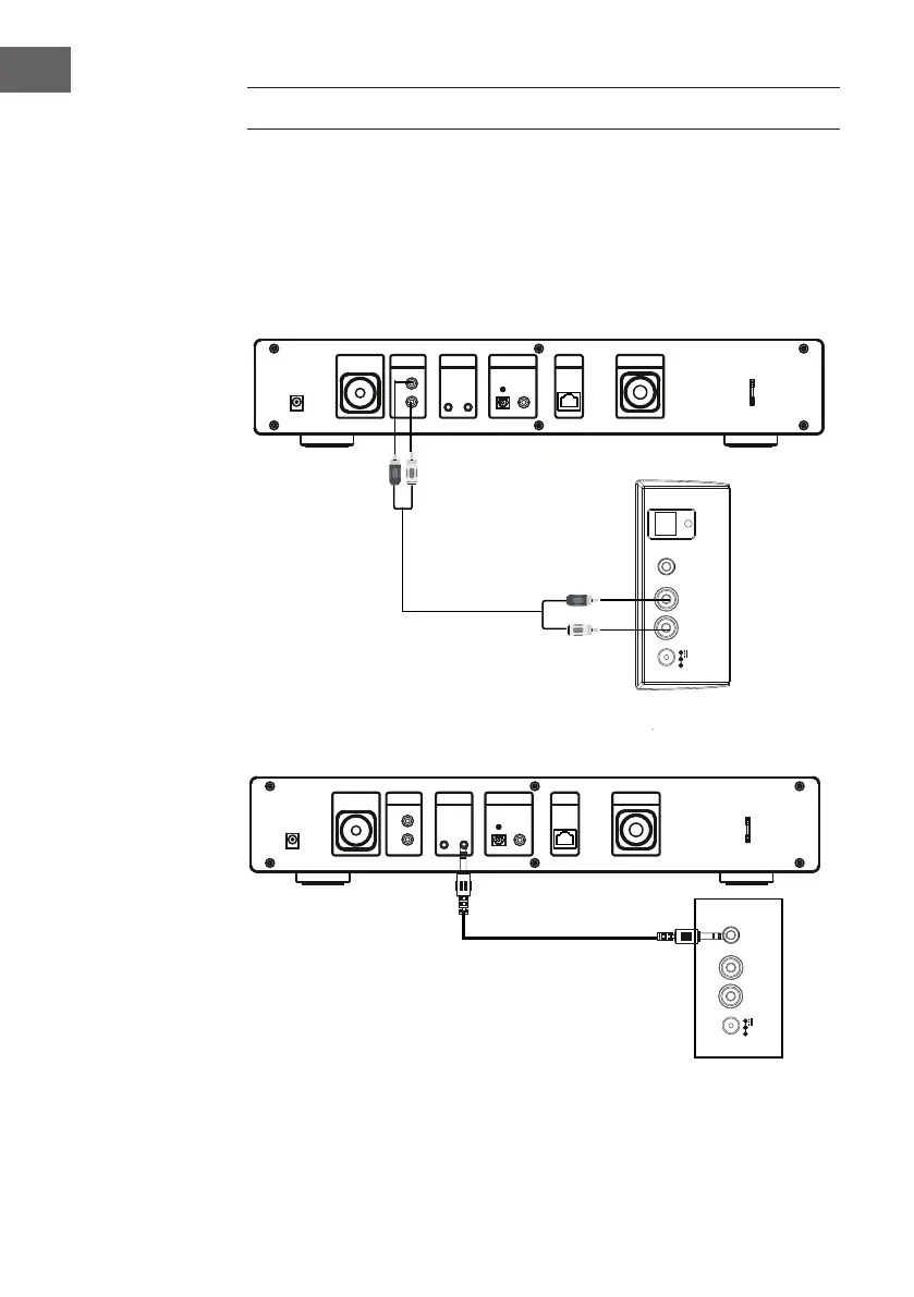 Branchement par câble sur la sortie AUX OUT 3,5 mm tel qu'illustré ci-dessous.