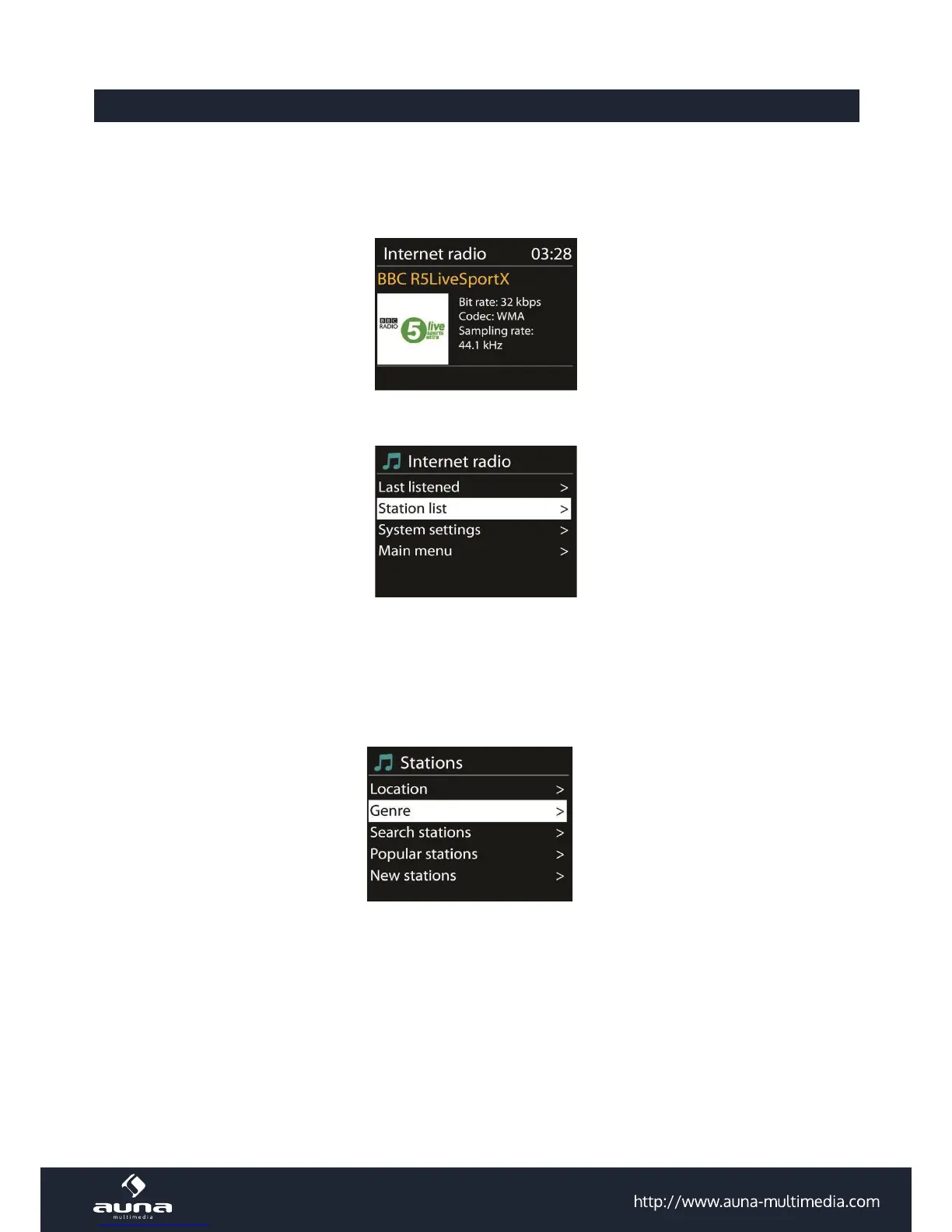 Wenn der Internet-Radio Modus gestartet wird, ist der letzte Sender ausgewählt. Um eine andere letztens gehörte