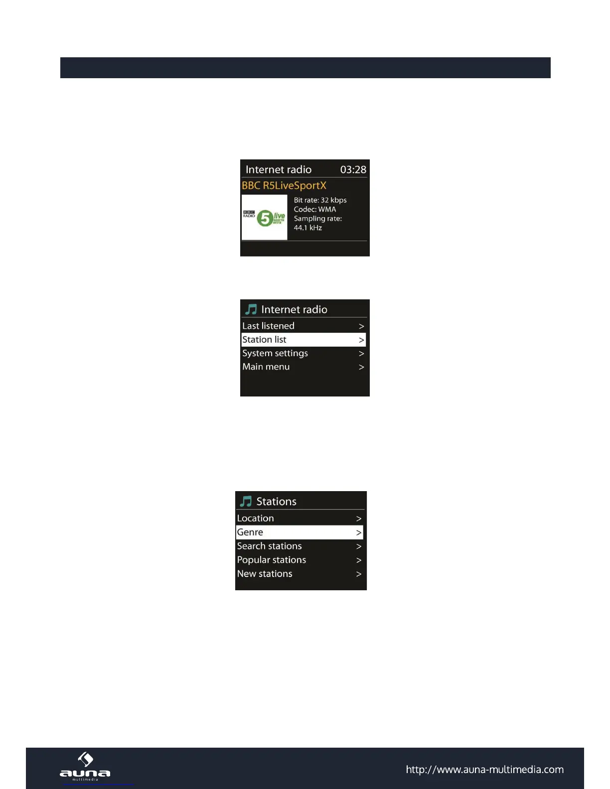 Une fois que « Internet-Radio » est sélectionné, l’appareil contacte le portail internet Frontier Silicon pour recueillir
